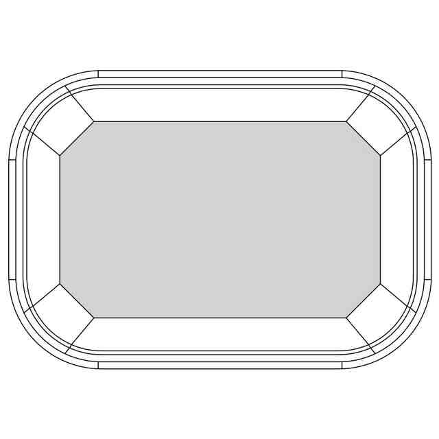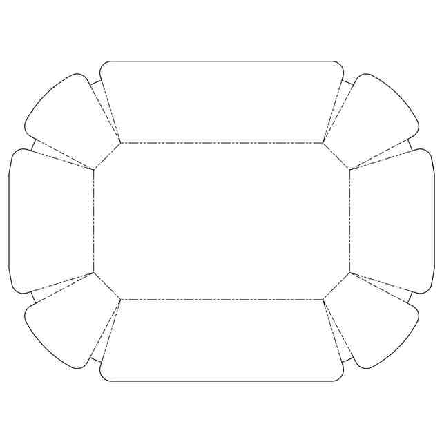 この物品は、参考展開図に示すシート状のブランクがプレス機によって成形されることによって形成される包装用容器である。参考展開図に示したブランクが破線において山折りで、二点鎖線において谷折りで折り曲げられつつ、ブランクが成形時に押圧されながら加熱されることによって、ブランクの表面に設けられた合成樹脂コーティング層が溶融し、ブランクが圧着されて包装用容器としての形状が保持される。さらに、ブランクの外縁が縁巻き加工されて、容器の縁部において、断面が略円形状である縁巻き部分が形成されることによって、全体的に強度が向上して容器の形状が安定的に保持される。この物品は、底面部が八角形を有し、側面部において段差が形成されて水平方向に2本の筋が形成されていることから捻じれに強く、ラップ包装やシュリンクフィルム包装に適する。