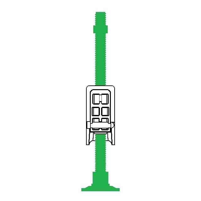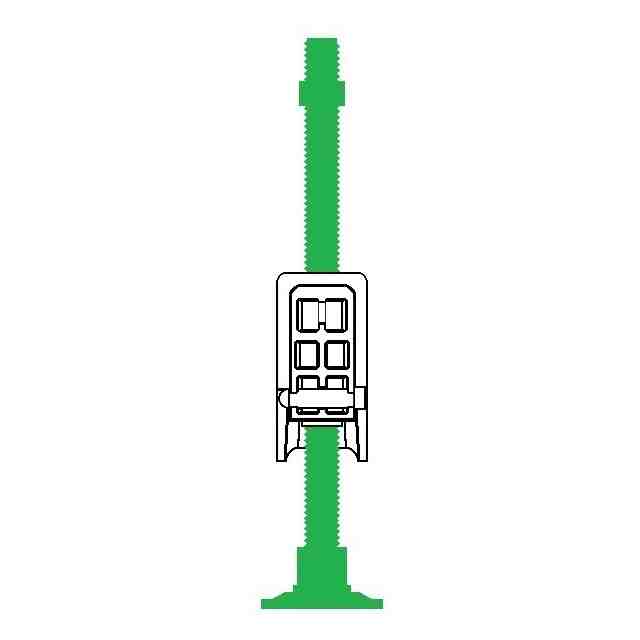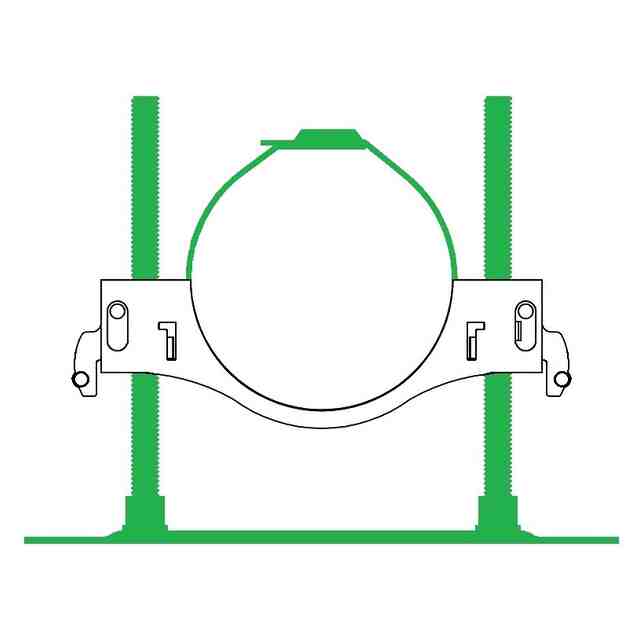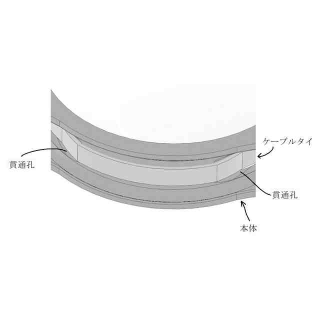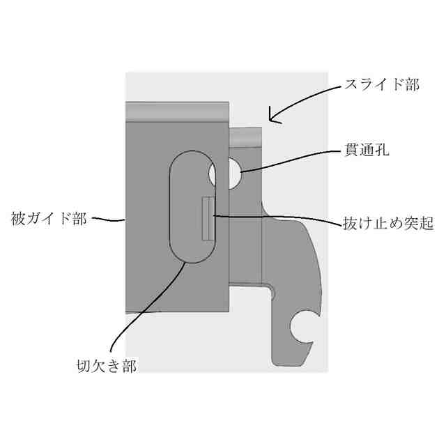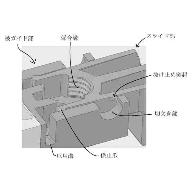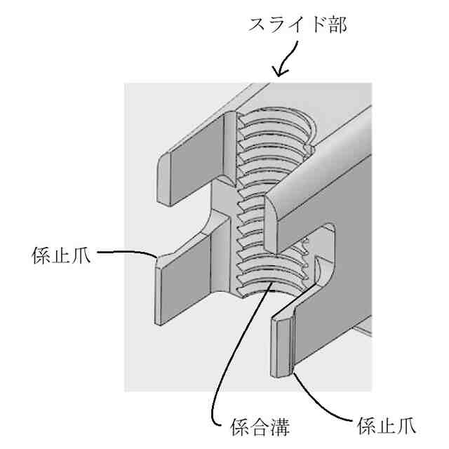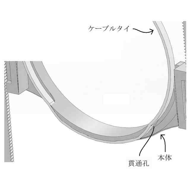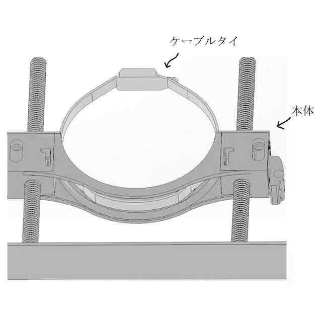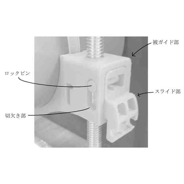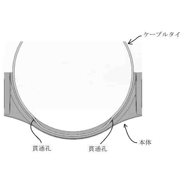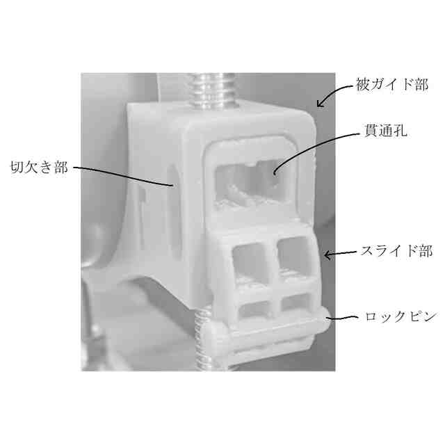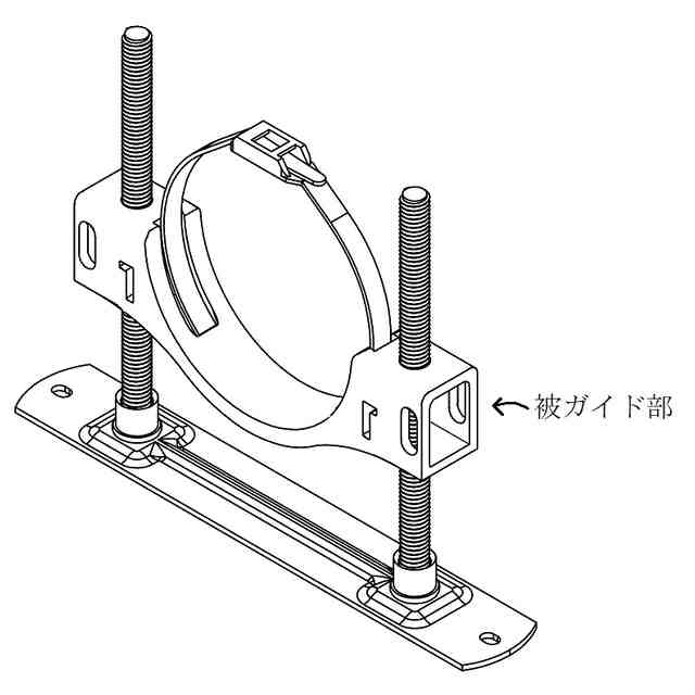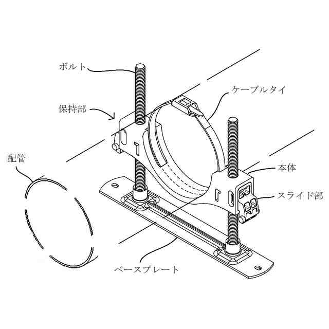 「使用状態を示す参考図」に示すように、本願意匠に係る物品「保持具」は、例えば、ベースプレートに設けられた左右一対のボルトにガイドされた状態でボルトの軸方向に移動する保持部によって配管(排水管等)を所定高さに保持するレベルバンドとして使用できるものであり、保持部は、左右一対のボルトにガイドされた状態でボルトの軸方向に移動可能な本体と、ボルト外面のねじ溝に係合する状態と係合しない状態とに進退移動する左右一対のスライド部と、本体に着脱自在であるケーブルタイとを含む。ベースプレート及びボルトは金属製、保持部は合成樹脂製である。保持部の本体の左右には、中空で略角筒状の被ガイド部が設けられていて(参考図1)、スライド部を被ガイド部内に挿入していくと、やがて係合溝がボルト外面のねじ溝に係合し、保持部の昇降は不可能となる(参考図2~5)。そして、この状態は、被ガイド部の爪用溝にスライド部の係止爪が係止することにより維持される。この維持をより確実に行おうとする場合には、ロックピンをスライド部から取り外し、被ガイド部の前後に設けられている切欠き部とスライド部に設けられている貫通孔とに差し込めばよい(参考図6、7)。一方、ロックピンを切欠き部と貫通孔とに差し込んでいない状態のスライド部は、被ガイド部から引き抜く方向に移動させることができ、係合溝がボルト外面のねじ溝に係合しなくなれば、保持部の昇降が可能となる。なお、スライド部が保持部から完全に抜けてしまうことは、被ガイド部の切欠き部の縁にスライド部の抜け止め突起との当接によって阻止される。ケーブルタイは、ケーブルタイを輪状にしたときに、その輪の一部が本体の下部の外(下)側を通るように、本体を内外(上下)方向に貫く左右の貫通孔に通して本体に装着することができる(参考図8~11)。また、保持部にアタッチメントを取り付ければ、より小径の配管を安定性良く保持することが可能となる(参考図12)。