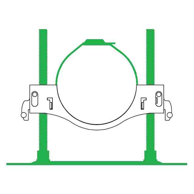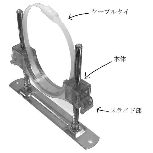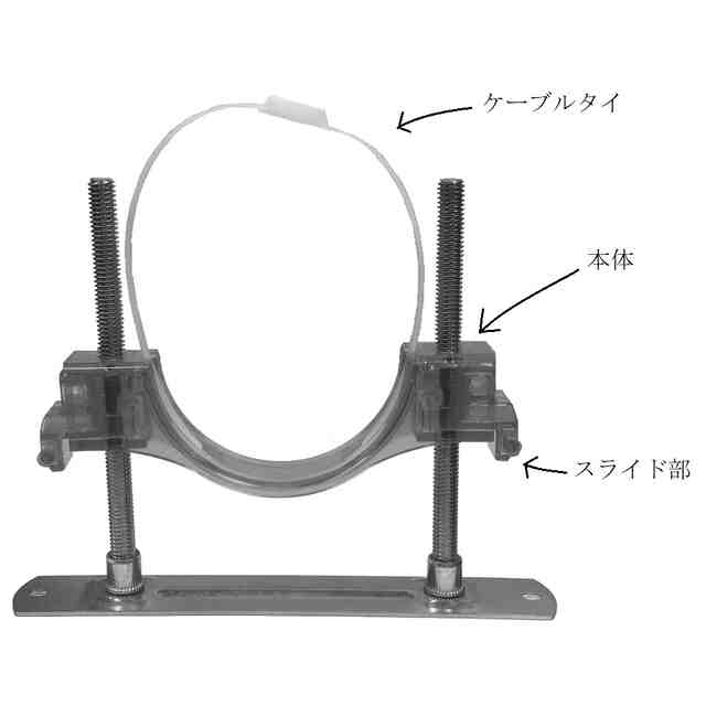 「使用状態を示す参考図」に示すように、本願意匠に係る物品「保持具」は、例えば、ベースプレートに設けられた左右一対のボルトにガイドされた状態でボルトの軸方向に移動する保持部によって配管(排水管等)を所定高さに保持するレベルバンドとして使用できるものであり、保持部は、左右一対のボルトにガイドされた状態でボルトの軸方向に移動可能な本体と、ボルト外面のねじ溝に係合する状態と係合しない状態とに進退移動する左右一対のスライド部と、本体に着脱自在であるケーブルタイとを含む。ベースプレート及びボルトは金属製、保持部は合成樹脂製である。保持部の本体の左右には、中空で略角筒状の被ガイド部が設けられていて(参考図1)、スライド部を被ガイド部内に挿入していくと、やがて係合溝がボルト外面のねじ溝に係合し、保持部の昇降は不可能となる(参考図2~5)。そして、この状態は、被ガイド部の爪用溝にスライド部の係止爪が係止することにより維持される。この維持をより確実に行おうとする場合には、ロックピンをスライド部から取り外し、被ガイド部の前後に設けられている切欠き部とスライド部に設けられている貫通孔とに差し込めばよい(参考図6、7)。一方、ロックピンを切欠き部と貫通孔とに差し込んでいない状態のスライド部は、被ガイド部から引き抜く方向に移動させることができ、係合溝がボルト外面のねじ溝に係合しなくなれば、保持部の昇降が可能となる。なお、スライド部が保持部から完全に抜けてしまうことは、被ガイド部の切欠き部の縁にスライド部の抜け止め突起との当接によって阻止される。ケーブルタイは、ケーブルタイを輪状にしたときに、その輪の一部が本体の下部の外(下)側を通るように、本体を内外(上下)方向に貫く左右の貫通孔に通して本体に装着することができる(参考図8~11)。また、保持部にアタッチメントを取り付ければ、より小径の配管を安定性良く保持することが可能となる(参考図12)。