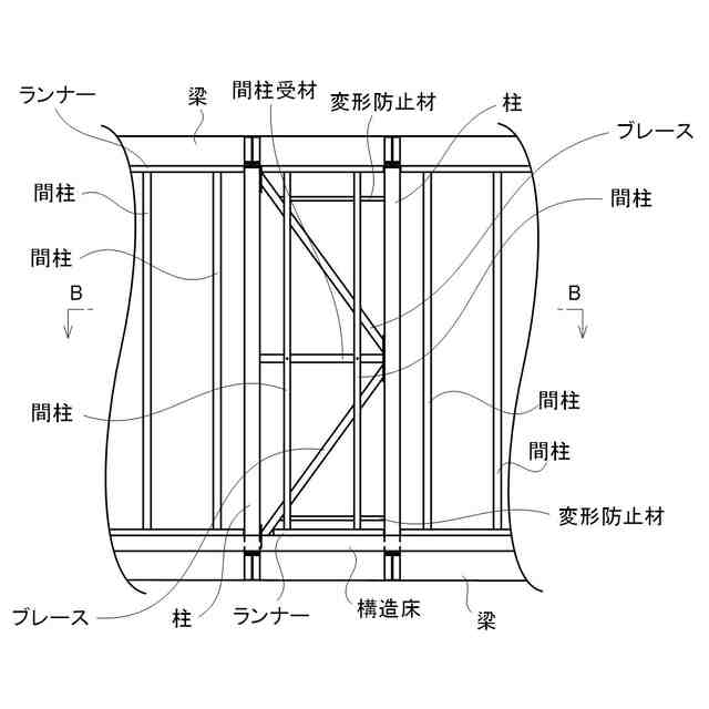 本物品は、家屋等の建築物の上下の梁間にボルトおよびナット等を用いて設置される金属製の耐力壁ユニットである。「使用状態を示す参考図」および「B-B断面の参考図」に示すように一対の柱間には各々の柱の延在方向の中途位置で水平方向に延びる間柱受材が設けられ、かつ、一対の柱間において間柱受材を挟んで上下両側にブレースが設けられている。さらに各々のブレースの延在方向の中途位置において、ブレースと柱との間には水平方向に延びて柱の曲げ変形を防止する変形防止材が設けられている。間柱受材を設けたことにより一対の柱間に設けられた間柱を間柱受材に固定でき、この間柱における支点間距離を短くすることが可能となる。この結果、間柱に要求される強度を抑えることができ、例えば間柱の断面積等を小さくすることが可能となる。