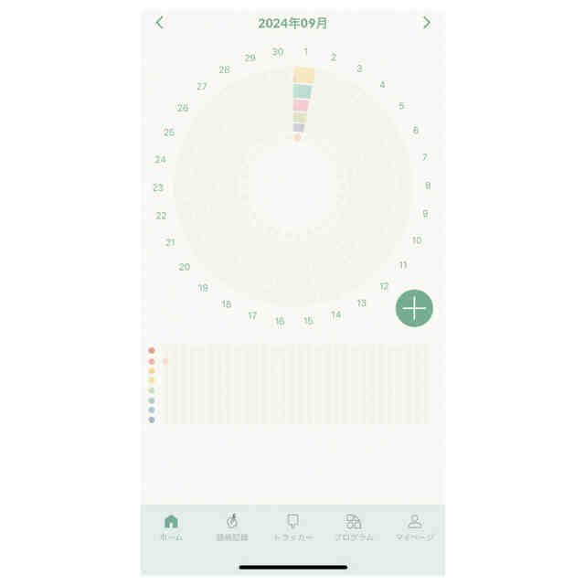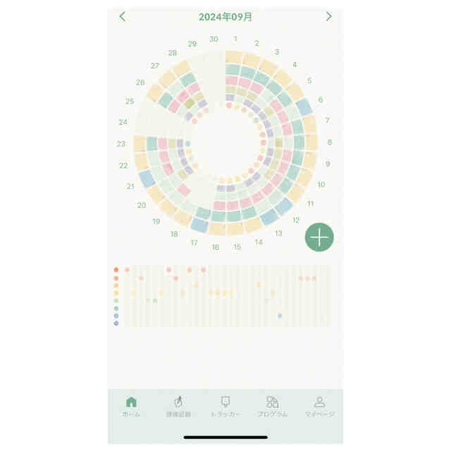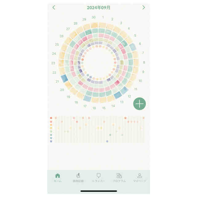 本画像は、行動や体調を管理するための画像である。画像中には、複数層からなる円環とその外側に環状に並ぶ数字が表され、当該数字は日付を示し、本画像は1か月に30日あるときの画像である。日付に対応するように各領域が並べて配置されることで、円環が構成されている。月の日数によって円環を構成する領域の数は変動する。ユーザーは、1日毎に、自らが設定した行動や体調に対応する各項目につき、行動の実施状況や体調の状態に応じて色を塗ることで、行動の実施状況や体調の状態を記録する。記録をしないときには、円環の一部の表示領域の下地の色彩が表れる。「画像図」は、1日も記録をしていないときの画像であり、「変化状態を示す画像図」は、1日目の記録日の複数の行動や体調の各項目につき記録をしたときの画像である。「使用状態を示す参考画像図1」は、1日目の記録日の行動や体調のすべての項目につき選択した色彩を付して行動の実施状況や体調の状態を記録したものであり、「使用状態を示す参考画像図2」は、1日目から16日目までの記録日に行動や体調のすべての項目につき選択した色彩を付して行動の実施状況や体調の状態を記録したものであり、「使用状態を示す参考画像図3」は、1日分の行動や体調の各項目の記録を全くしていない場合、1日分の行動や体調の各項目のうち記録をしていない項目がある場合に、円環の一部の表示領域の下地の色彩が表れているものである。「使用状態を示す参考画像図4」は、すべての日において行動や体調の各項目につき色彩を付して行動の実施状況や体調の状態のすべてを記録したものである。ユーザーが日付毎に着色して記録することにより、ユーザーによって異なる色彩の円環状の表示領域が表される。