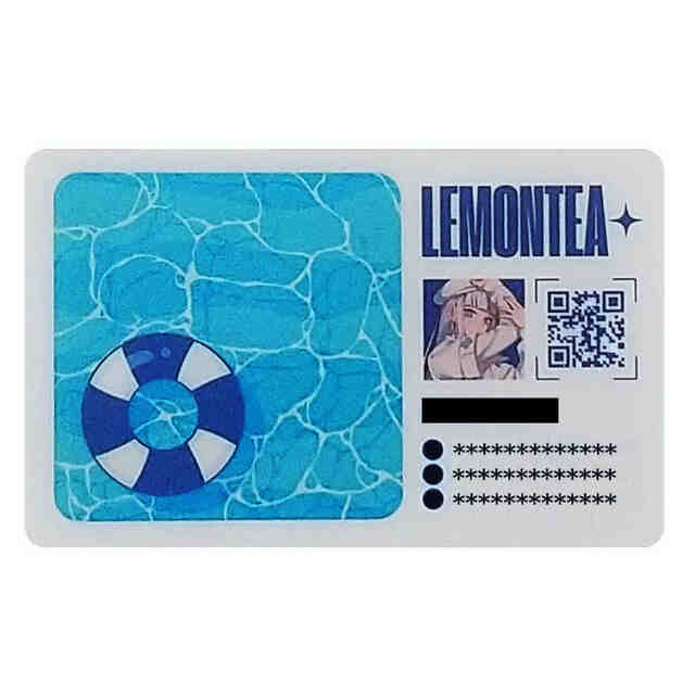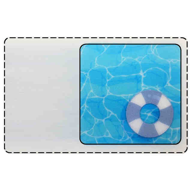 本意匠に係る名刺台紙は、プラスチック製であって、水を張ったプールの一部を模した部分と、プール内に位置する円形の浮き輪を模した部分とから構成された領域を有する。当該領域は、透明である。使用状態を示す参考図に示すとおり、当該領域以外の部分には、名前のほかに、使用者の情報が記憶されたQRコード等を印刷することができる。