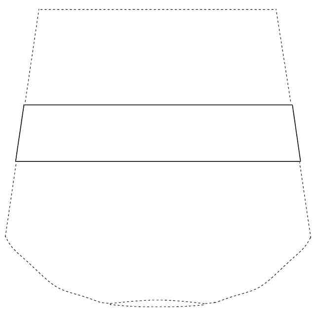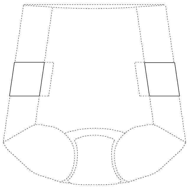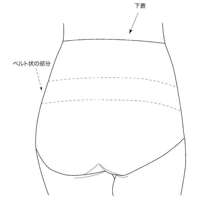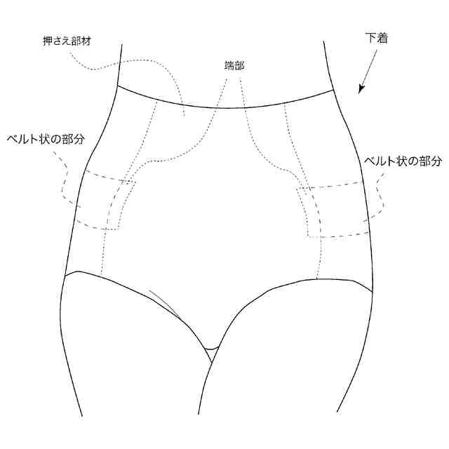 実線で表した部分が、意匠登録を受けようとする部分である。意匠登録を受けようとする部分はベルト状の部分である。本物品(下着)を裏返すことによって意匠登録を受けようとする部分が表れる。裏返した状態の右側面図は裏返した状態の左側面図と対称に表れるため省略する。裏返した状態を正面側から見た参考斜視図1と裏返した状態を背面側から見た参考斜視図2において、ワインレッドの部分がベルト状の部分である。また、裏返した状態を正面側から見た参考斜視図3および裏返した状態を背面側から見た参考斜視図4において、ブルーの部分がベルト状の部分である。裏返した状態を正面側から見た参考斜視図1および裏返した状態を正面側から見た参考斜視図3にあるように、ベルト状の部分の両端側には押さえ部材の裏側に隠れる端部が存在する。着用した状態を正面側から見た参考斜視図5および着用した状態を背面側から見た参考斜視図6において、下着の裏側に存在するベルト状の部分を長い破線、下着の裏側に存在する押さえ部材と端部を短い破線で表示してある。