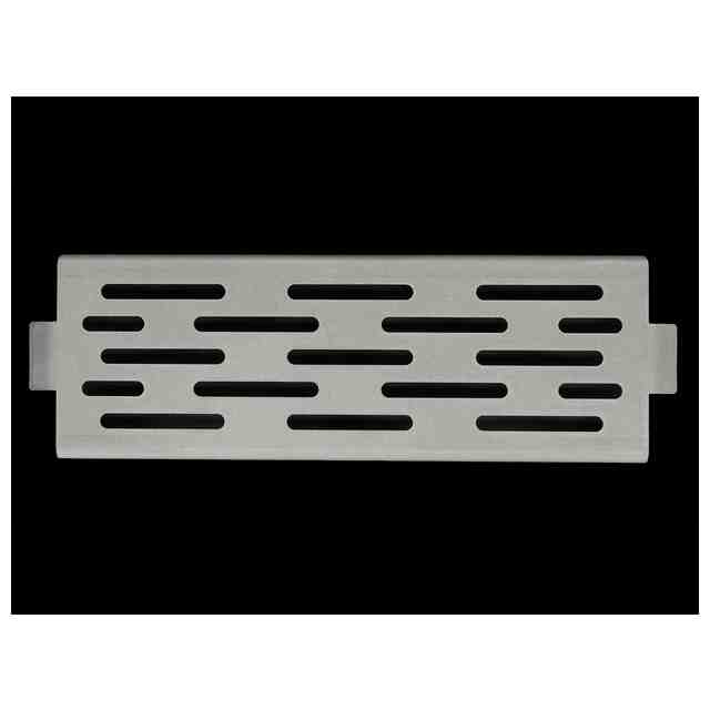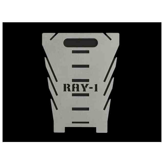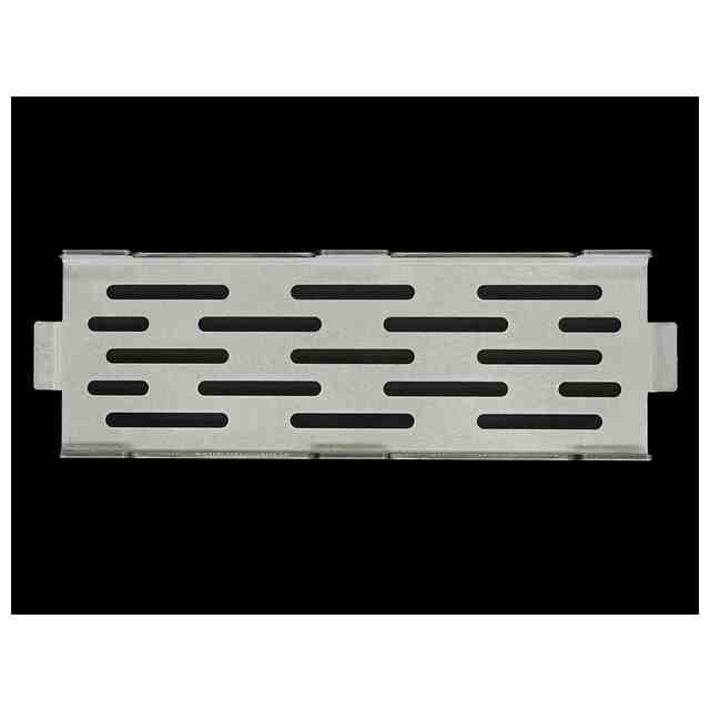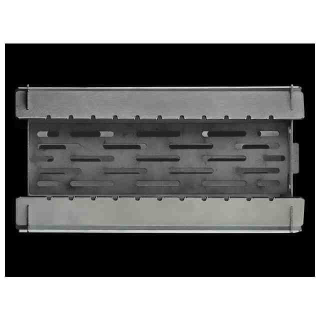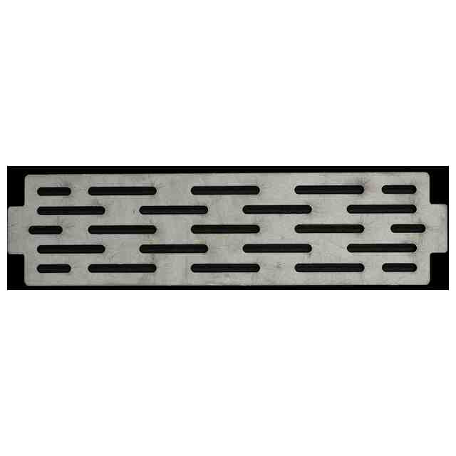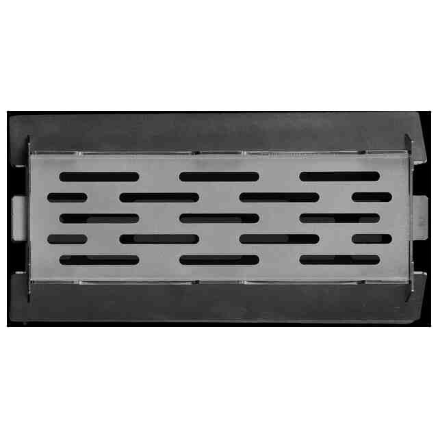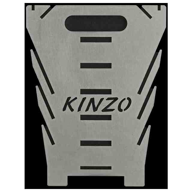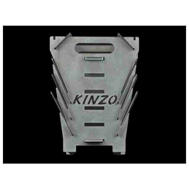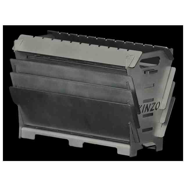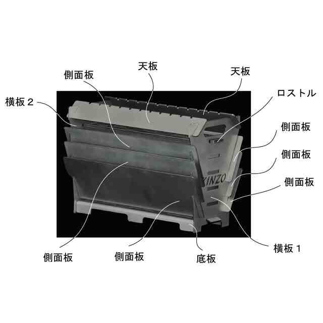 本物品は、キャンプ場などで焚火をする際に使用する組み立て式の焚火台である。本物品は、参考図1及び参考図2に示すように、1枚の底板と、横板1及び横板2と、6枚の側面板と、2枚の天板と、1枚のロストルとからなり、これらの部材をキャンプ場などの現場で組み立てて焚火台として使用する。本物品の組み立ては、例えば、次のように行う。まず、横板1及び横板2の下部にそれぞれ設けられた矩形穴に、底板の一対の突起部をそれぞれ挿入する。次いで、横板1と横板2とが向かい合った状態(以降、この状態で作業する。)で、横板1の左辺部(又は右辺部)に設けられた切れ込みと、この切れ込みと同じ高さに設けられた、横板2の右辺部(又は左辺部)に設けられた切れ込みに、側面板に設けられた一対の切れ込みがそれぞれ嵌合するよう6枚の側面板をそれぞれ挿入する。続いて、横板1に設けられた矩形穴と、この矩形穴と同じ高さに設けられた、横板2に設けられた矩形穴に、ロストルに設けられた一対の突起部がそれぞれ嵌合するようロストルを挿入する。最後に、横板1の左辺上部(又は右辺上部)に設けられた切れ込みと、横板2の右辺上部(又は左辺上部)に設けられた切れ込みに、天板に設けられた一対の切れ込みがそれぞれ嵌合するよう2枚の天板をそれぞれ挿入することで焚火台が組み上がる。本物品によれば、横板1及び横板2の矩形穴は高さ方向に複数設けられており、相対する矩形穴を選択することにより、ロストル上に置かれる燃料の高さを調整することができる。また、一対の天板上に、鍋やフライパン、五徳などを設置でき、天板上辺に設けられた相対する切欠きには串を掛け渡すことができる。さらに、参考図3に示すように、本物品は、複数セット用意し、各部材を共用して組み立てることにより、複数セットを連結させて使用することもできる。なお、参考図3に示す焚火台は本物品を2セット使用している。
