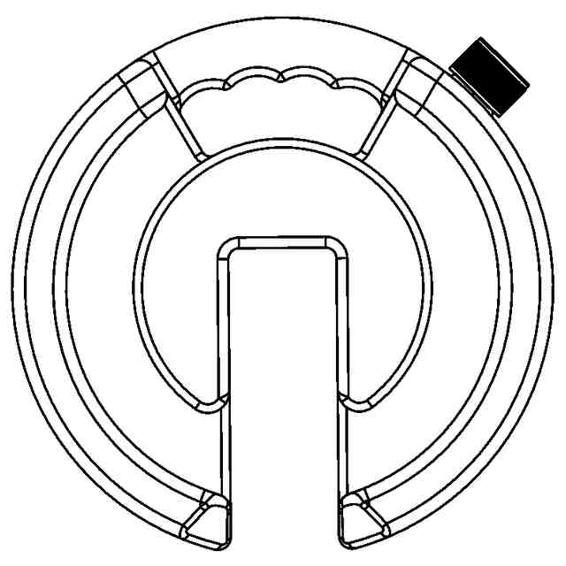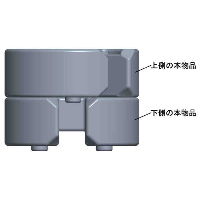 本物品は、水などの液体を収納するタンクである。本物品の右側面には着脱可能なキャップが取り付けられており、このキャップを外すことで中に液体を注入することができる。本物品は、「平面図」に示すように、正面方向に向けて開口する略コ字形の切り欠き形状を有する。また、本物品は、「平面図」に示すように、上面に円弧状の溝部を有する。また、本物品は、「底面図」に示すように、下面に複数の凸部を有する。「使用状態を示す参考図(1)」に示すように本物品を重ねると、下側の本物品の溝部に対し、上側の本物品の凸部が嵌合する。このとき、「使用状態を示す参考図(2)」に示すように上下の本物品の切り欠き形状の開口方向をずらすことで、平面視中央に貫通孔が形成される。この貫通孔にパイプ等を挿入することで、囲い、テント、パラソルなどの支柱を安定的に設置するウェイトとして使用することができる。