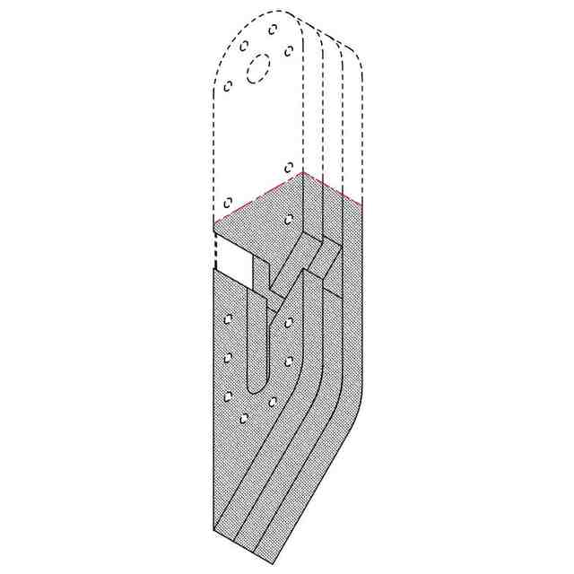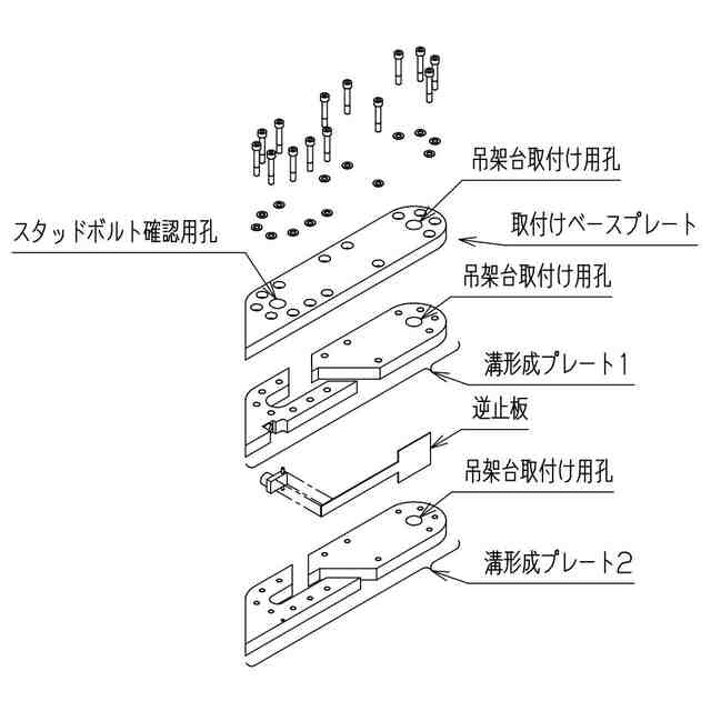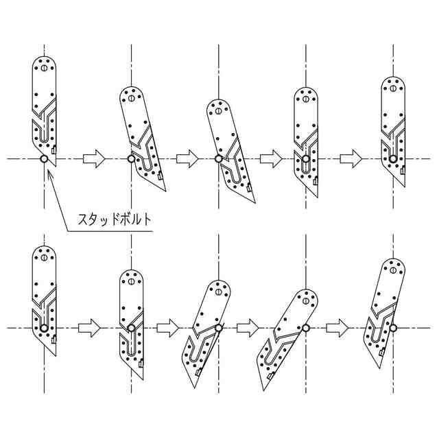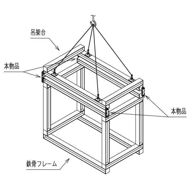 この意匠に係る物品は、揚重作業を行う際に、吊架台などとともに使用される吊金具である。使用状態を示す参考図1,2に示すように、例えば、鉄骨フレームの4隅にスタッドボルトを設け、これに対応する吊架台の4隅に本物品を取り付ける。そして、クレーンフックに掛けた吊架台をクレーンにて巻き上げ/巻き下げすることで、鉄骨フレームの4隅に設けられたスタッドボルトに本物品を装着/取り外しすることができるものである。より詳細には、使用状態を示す参考図3,4に示すように、吊架台の上下動によって本物品が回動し、スタッドボルトへの装着/取り外しが可能となっている。なお、使用状態を示す参考図4は、取付けベースプレートを外した状態で、上段が装着、下段が取り外しの過程を示している。