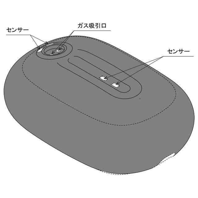 この意匠に係る物品は、皮膚ガス測定器である。意匠登録を受けようとする部分を示す参考図1に示すように、本物品にはガス吸引口やセンサー等が設けられている。使用状態を示す参考図に示すように、本物品に手を乗せることにより、ガス吸引口から、皮膚から発生するガスが吸引されるとともにセンサーから体温等の情報が取得される。取得されたガス等の各種情報を専用アプリケーションソフトに送信し、ストレス状態等の測定に使用することができる。