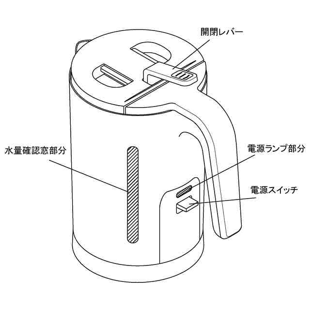 「各部の名称を示す参考斜視図」において、斜線を付した水量確認窓部分及び電源ランプ部分は透明である。