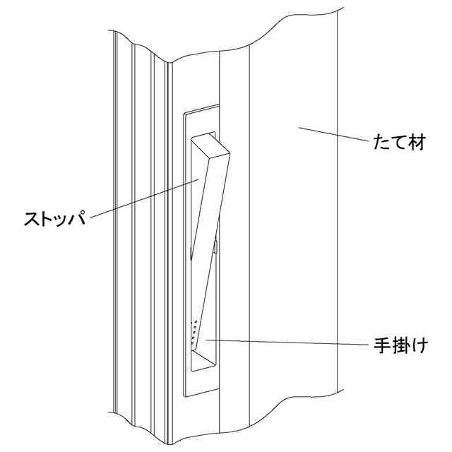 本物品は、「作動している状態を示す斜視図2」にあるように、ストッパ下部を押すとストッパ上部が突出し、たて材と当接することにより、指はさみを防止する引き違い窓の引手です。