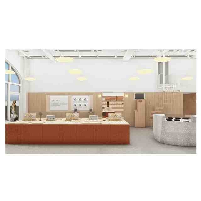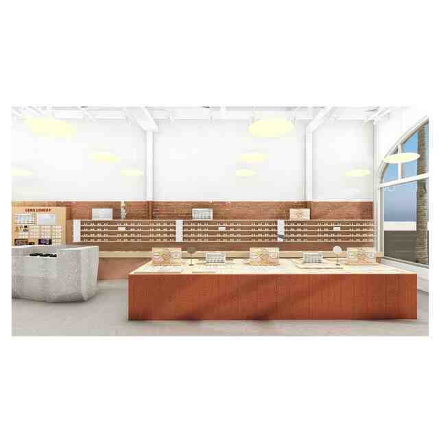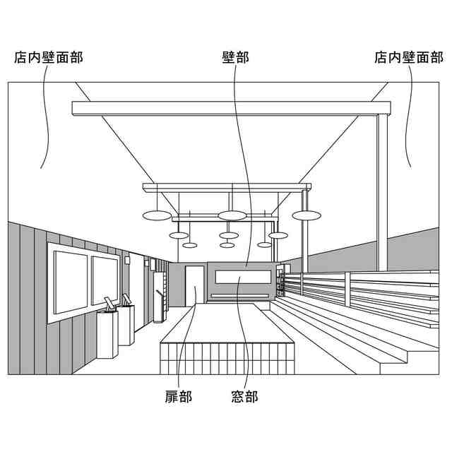 本建築物は、眼鏡などの物品を展示または販売する商業施設内のテナント店舗や路面店舗に関する。「正面側透視図」に開示されるとおり、本建築物は、正面奥側の上方が吹き抜けになっている壁部と同じ高さの位置で店内壁面部が上下ツートーンの明暗調子としてあらわれるものである。店内壁面部の明暗調子の境界を壁部とそろえ、かつ下方を壁部と同じ暗調子とすることで、上方の明調子部分との対比によって、天井の低い日本家屋を思わせる均整の取れた落ち着いた店内空間を演出するものである。