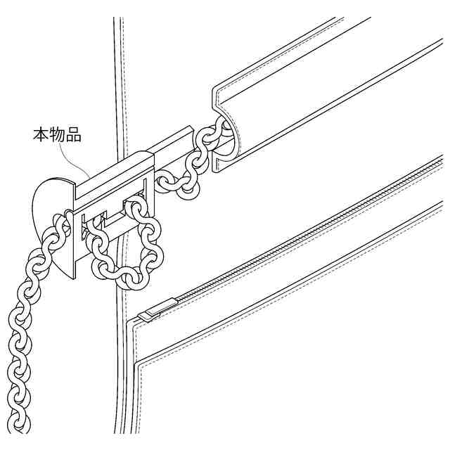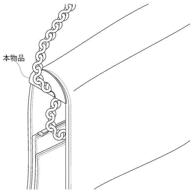 本願意匠に係る物品は、バッグ等持ち手用チェーンの保護機能付き調節具である。使用状態を表す参考図1に示すように、本物品は、バッグ等のフラップの内側に取り付けることができる。またその際、使用状態を表す参考図2に示すように、持ち手用チェーンの一部を収容するように着脱可能に備え付け、持ち手用チェーンの長さを調節することができる。さらに、使用状態を表す参考図3に示すように、本物品が持ち手用チェーンとフラップの端部との間に介挿することで、持ち手用チェーンがフラップの端部に直接接触して擦り切れ、損傷するのを防止することもできる。