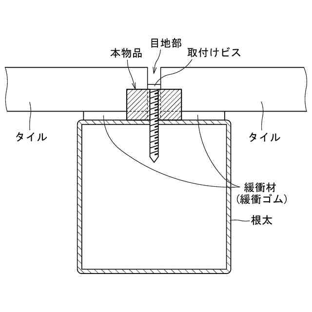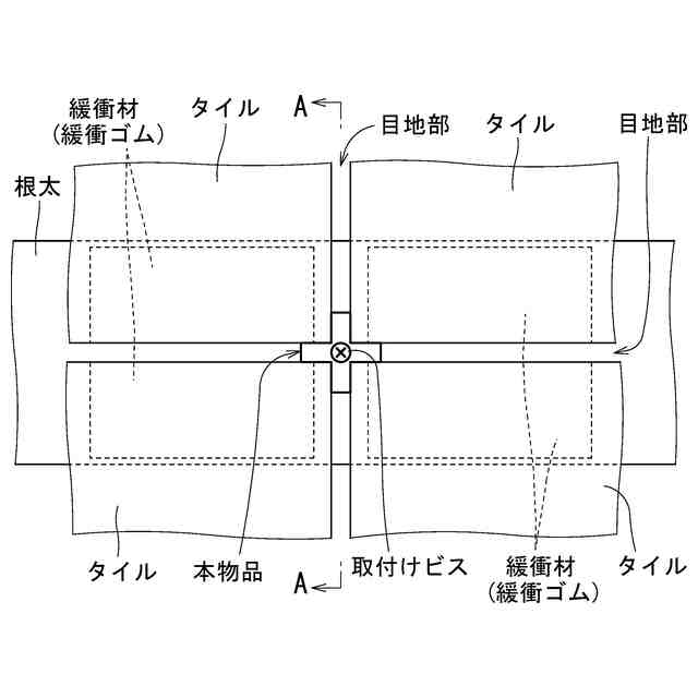 本物品は、その中央に平面視円形の貫通孔を有し、直角に交差する十字形の立体物であり、水平ないし略水平な床面および垂直ないし斜めに立てられた壁面等の敷設面上に、複数の矩形または方形のタイルを、所定の目地間隔で規則正しく配列して位置決め・支持するための施工用の補助固定具である。本物品は、[使用状態を示す参考図]および[A-A断面拡大図]に示すように、コンクリート等の躯体(床下地材)の上に支持脚で支持された複数の根太の所定の位置に取付けビスにより取付けられ、たとえば4枚のタイルの四隅を互いに位置決め・支持することによって、これらタイルを安定性に配列すると共に目地部から下に雨水などを効率よく排水することができ、水はけに優れるなどの効果を奏するものである。