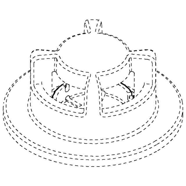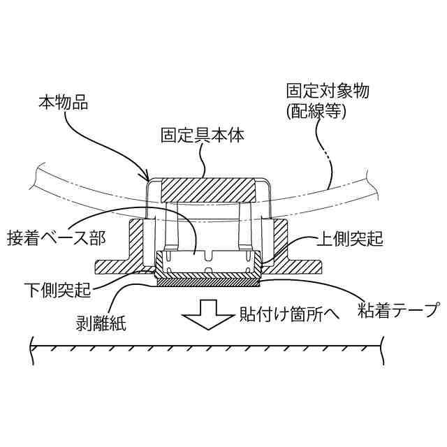 本願意匠に係る物品は、たとえばロープロファイル対応パソコンまたは屋外等多様な箇所において、各種部材を配置、接続、固定等するために使用されるものである。接着ベース部の円筒側突起は平面視60度ずつずれており、重ならない様に配置されている。本体との嵌合時に、接着ベース部の上側突起は本体に先に嵌合し、仮固定され、さらに押し込むと下側突起が本体内壁の突起と干渉し大きな抵抗が発生し接着ベース部により粘着テープを押し付け粘着テープのさらなる貼付け力を引き出すことができる。また、接着ベース部底面の中心をつなぎ合わせたことで全体的に剛性感があり、固定具本体嵌合時に接着ベース部に抵抗が発生し、粘着テープを被着体(基板)にシッカリと押しつけることが可能となるため前記粘着テープの強度を引き出すことができる。さらに力を加えることで接着ベース部が固定具本体に完全に格納され、抵抗感が抜けた時点で、押し込み完了の合図となる。