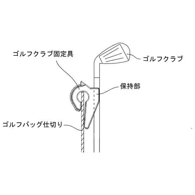 本願の意匠に係る物品はゴルフクラブ固定具であり、ゴルフバッグ内の仕切りを挟持する把持部と、ゴルフクラブのシャフトを保持する保持部とを有しており、ゴルフバッグの仕切りにゴルフクラブを固定して、移動時にゴルフクラブ同士がぶつかり合うのを防止するものである。