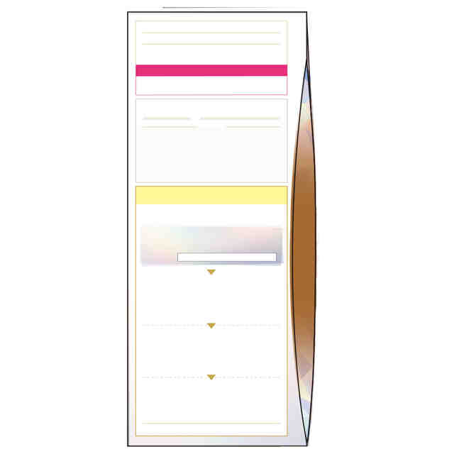 背面図、底面図および縮小展開図に表れる破線は、ミシン目を示すものである。また、色彩を表さない部分は白色である。