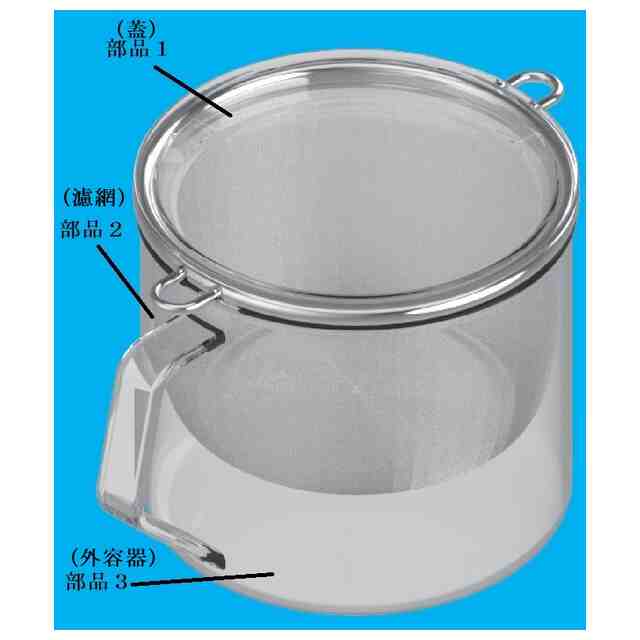 本物品は、市販のヨーグルトに含まれるホエイを抜き取り、水切りヨーグルトを作るための調理器具(ヨーグルトフィルターボウル)である。本物品は、参考図に示すように、蓋(部品1)、濾網(水切りザル)(部品2)、及び外容器(部品3)から成る。本物品の使用時には、外容器にセットした水切りザルにヨーグルトを入れ、蓋をして放置することで水切りを行うことができる。