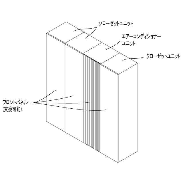 本物品はクローゼットユニットを備えたエアーコンディショナーである。エアーコンディショナーユニットは、空調した空気を正面側から吹き出すものであり、室内に置く家具であるクローゼットユニットと調和するような外観を有している。また、エアーコンディショナーユニット及び各クローゼットユニットのフロントパネルは、室内のインテリアに合わせて交換可能となっている。 本物品は、1個のエアーコンディショナーユニットと、3個のクローゼットユニットから構成されているが、一部のクローゼットユニットを分離して、使用状態を示す参考図2及び3に示すように、1個のエアーコンディショナーユニットと、1個のクローゼットユニットの状態でも使用可能である。 尚、各クローゼットユニットの正面扉は若干前方へ移動しつつ開閉可能な扉となっている