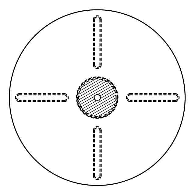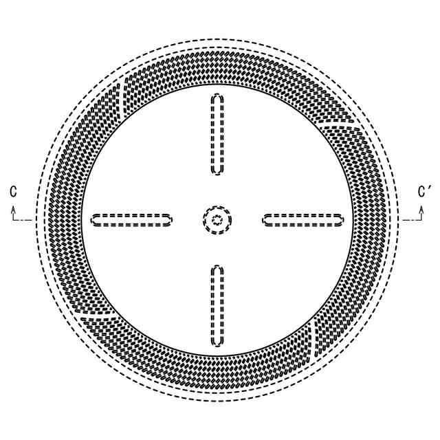 実線で表された部分が部分意匠として意匠登録を受けようとする部分であり、「内部構造を省略したA-A′線断面図」、「内部構造を省略したC-C′線断面図」、「D-E部分拡大図」を含めて意匠登録を受けようとする部分を特定している。「B-B′部分拡大図」、「D-E部分拡大図」における二点鎖線は、指示線によって区切られた拡大箇所の周縁のみを示す線である。