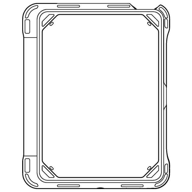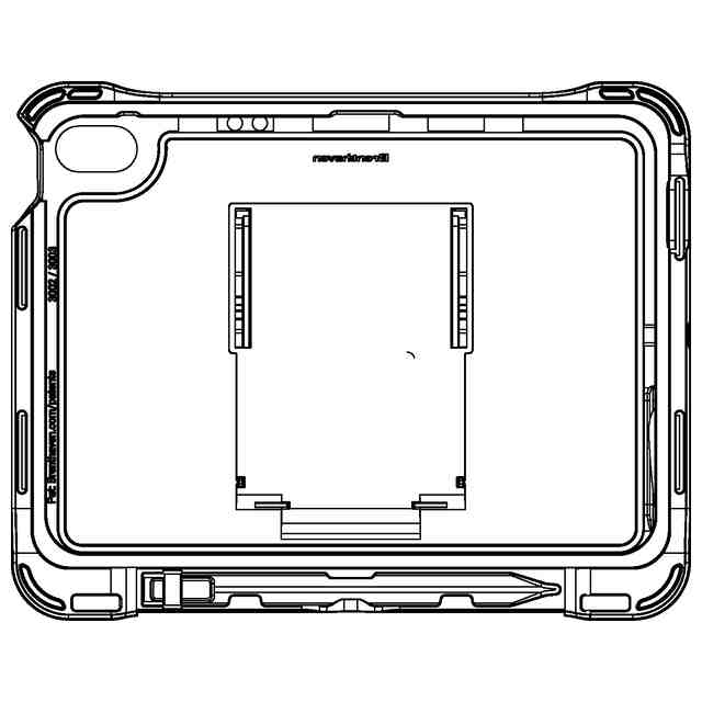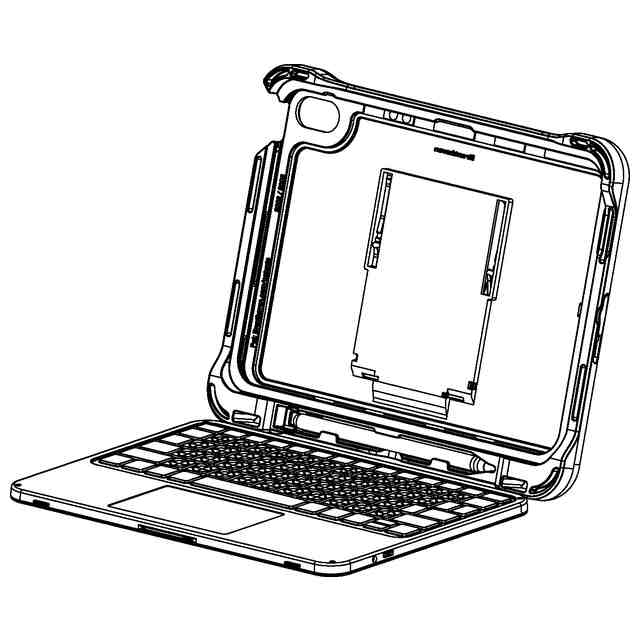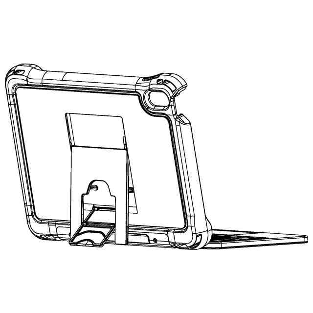 本物品は、ケース部とキーボードから構成される、キーボード付きの携帯用電子機器用のケースである。斜視図1のケース部背面中央において、スタンド機構をスライドさせた結果、上部にあらわれた略横長長方形部分は窪みである。