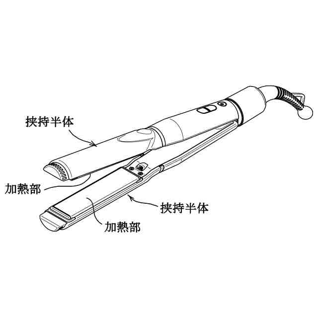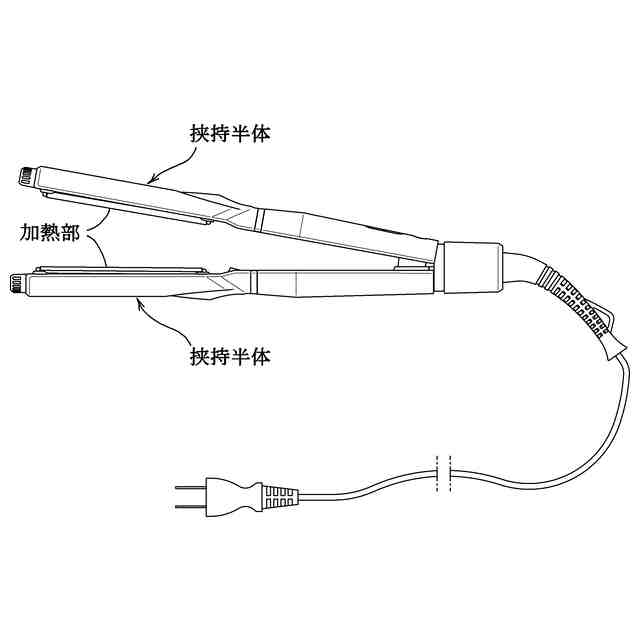 本物品は、「参考図」及び「使用状態を示す参考図」に図示したように、各挟持半体の内面に設けた加熱部で頭髪を挟みスライドさせることで、頭髪をストレートにするヘアアイロンである。本物品の全長は約35cmで、各挟持半体の加熱部が設けられた部分の幅は約3cmである。