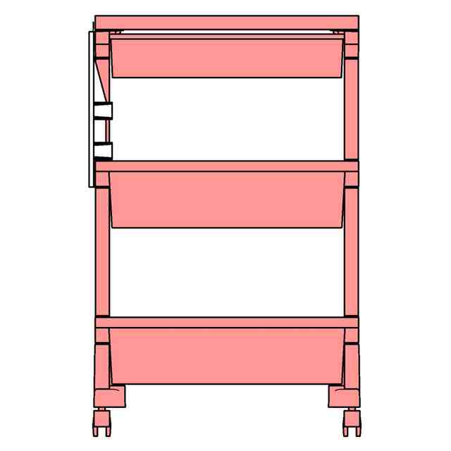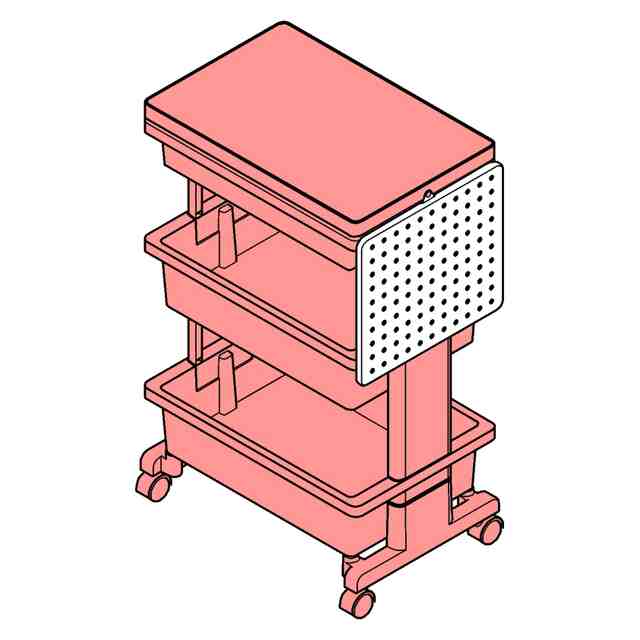 本物品は、台所用品・日用品などを収納する上部開口型収納部を上下複数段設けた合成樹脂製の収納ケースであって、物掛け用フックを付設する小孔を多数設けた有孔ボード(ペグボード)を、側部の柱部分に設けた収納ケースである。