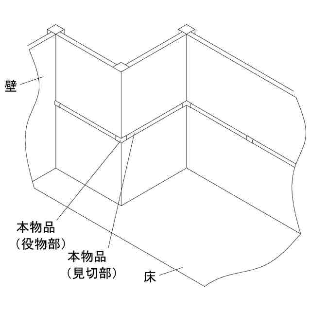 本物品は建物の壁、壁と天井の取り合いに設置される合成樹脂製の縁材に関し、直線状に延びる幅13mm、高さ4.5mmの見切部と出隅に設置される幅14mm、高さ4.5mm、一辺の長さ25mmの役物部を有する。