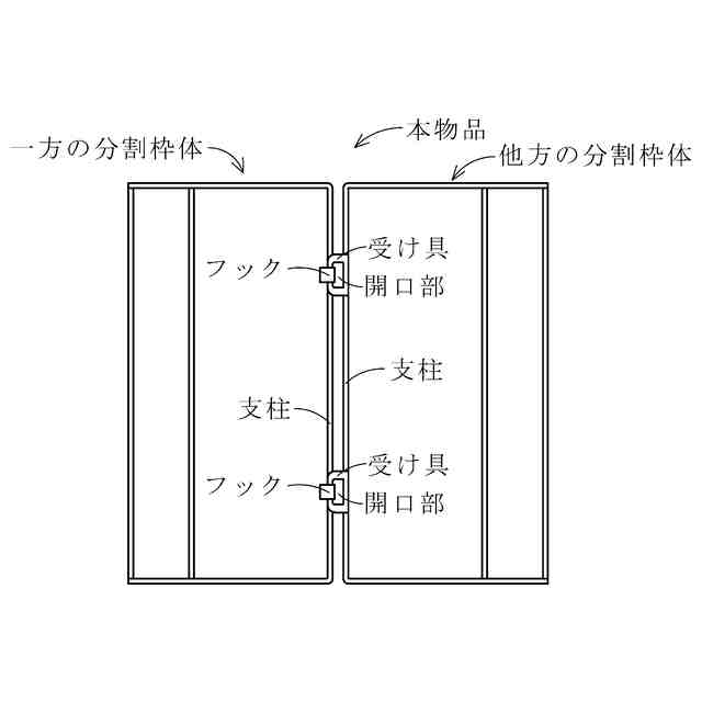 実線で表された部分が、部分意匠として意匠登録を受けようとする部分である。一点鎖線は、意匠登録を受けようとする部分とその他の部分との境界のみを示す。底面図は平面図と対称に現れるので省略する。一方の分割枠体の底面図は平面図と対称に現れるので省略する。他方の分割枠体の底面図は平面図と対称に現れるので省略する。