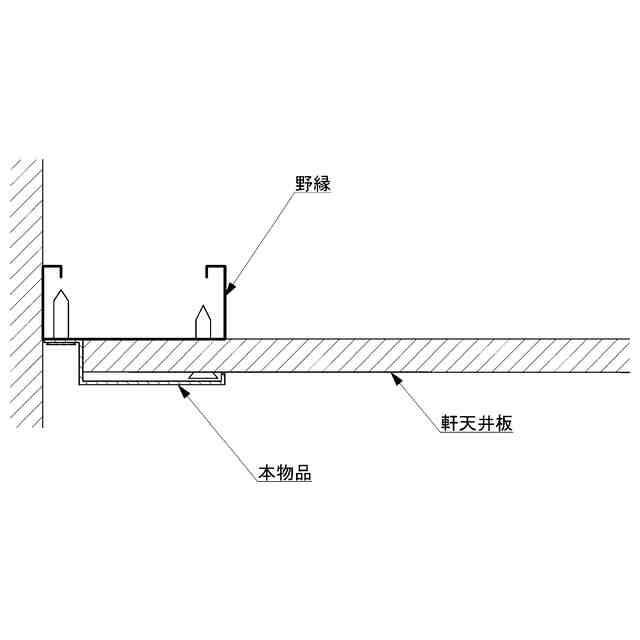 本物品は、使用状態を示す参考概略図のように、軒天井板の軒元側又は軒先側の端部を支持する見切縁材として使用するものである。