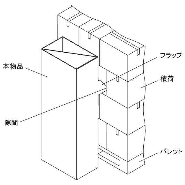 本物品は、組み立て式の輸送用緩衝材に関し、コンテナやトラック等で積荷を輸送する際に使用され、輸送時にコンテナのコンテナ壁面やトラックの荷室壁面と積荷との間に配置可能な輸送用緩衝材に関する。本物品は、展開図に示されるように、平板状の部材から組み立て可能であり、外形が略直方体形状をなす筒状の物品本体と、当該物品本体の辺縁から突設されたフラップとを具備する。使用状態を示す参考図、及び、挿入途中を示す参考図に示されるように、パレット上に複数の積荷を積載した状態で、互いに隣り合う積荷の間の隙間にフラップを挿入することで、本物品を積荷に取り付けることができる。コンテナ壁面等と積荷との間に本物品が配置されることで輸送時における積荷の位置ずれや荷崩れ等を防ぐことができる。輸送完了後は、フラップを隙間から抜き取り、展開図に示すように、平板状の部材に展開した状態で処分することができる。