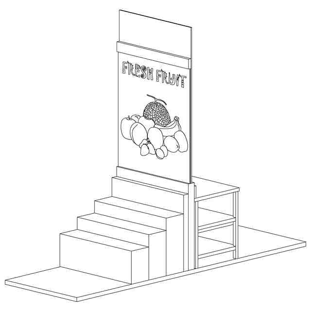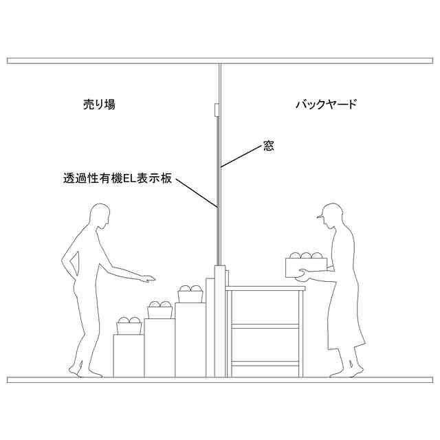 本物品は、スーパーマーケットなどの店舗の内装であって、「参考図1」に示すように、店舗において、隣接する空間である売り場とバックヤード、これらの空間を仕切る天井に達する窓とその売り場側に設置した透過性有機ELによる表示板を含むものである。「参考図2」に示すように、透過性有機ELによる表示板は、通電状態、非通電状態を通じて透光性を有し、窓も透光性を有するため、売り場とバックヤードは、ユーザーをして視覚的に一続きの空間として認識される。「参考図3」に示すように、透過性有機ELによる表示板には、通電状態において、静止画及び動画やPOP等の情報が表示されるため、買い物客は、表示板に表れた情報を確認しつつ、買い物を続けることができる。