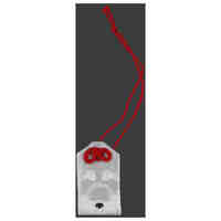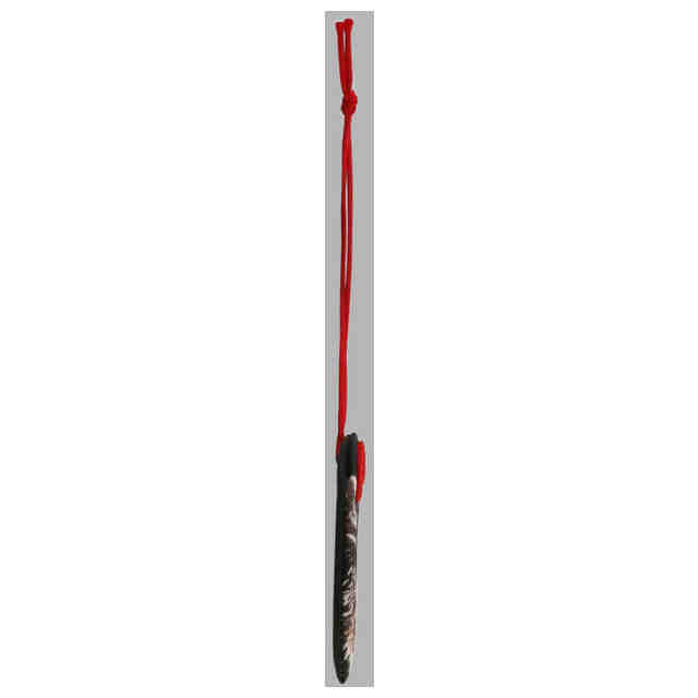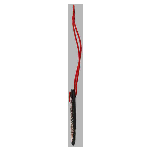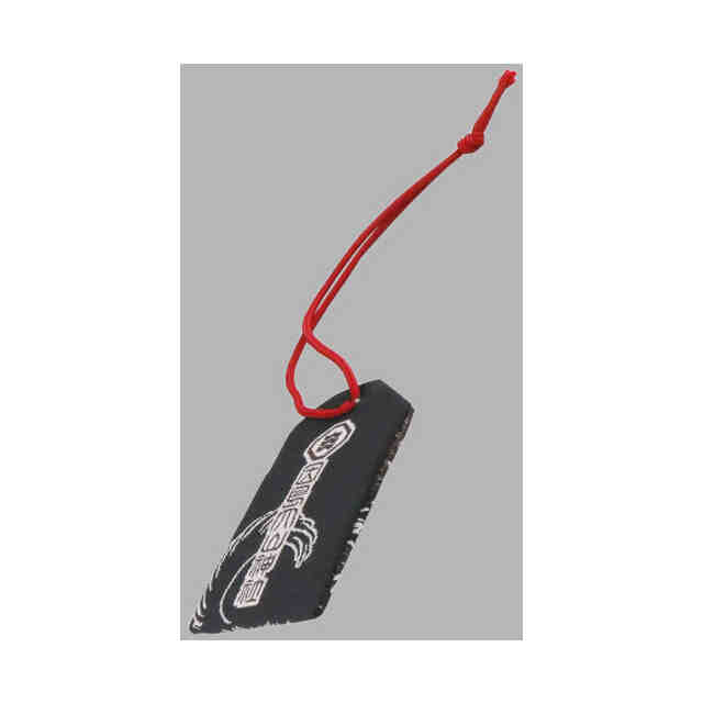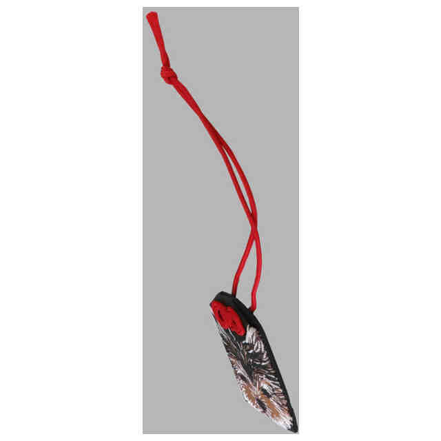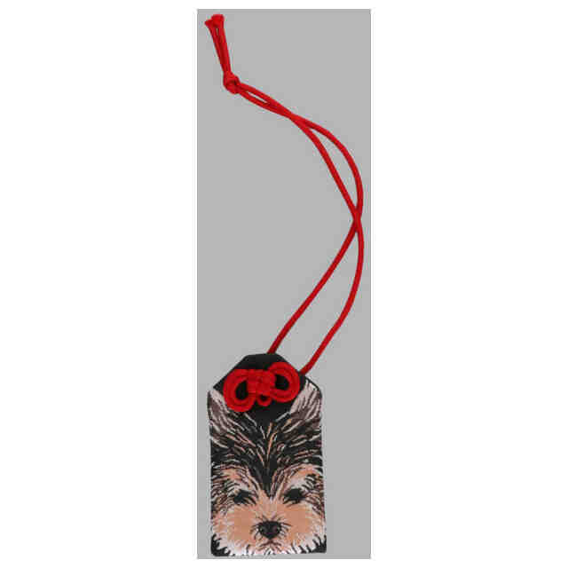 本件お守りに関する意匠は、伝統的な形の錦の御守りに、犬の種類であるヨークシャーテリアの模様や毛質を織地にてデザインしたもの。表面は、御守りの形にあわせ、犬の顔面の要素を抽出した様相のデザイン。裏面は、犬の背中側から尻尾までの様相のデザインである。