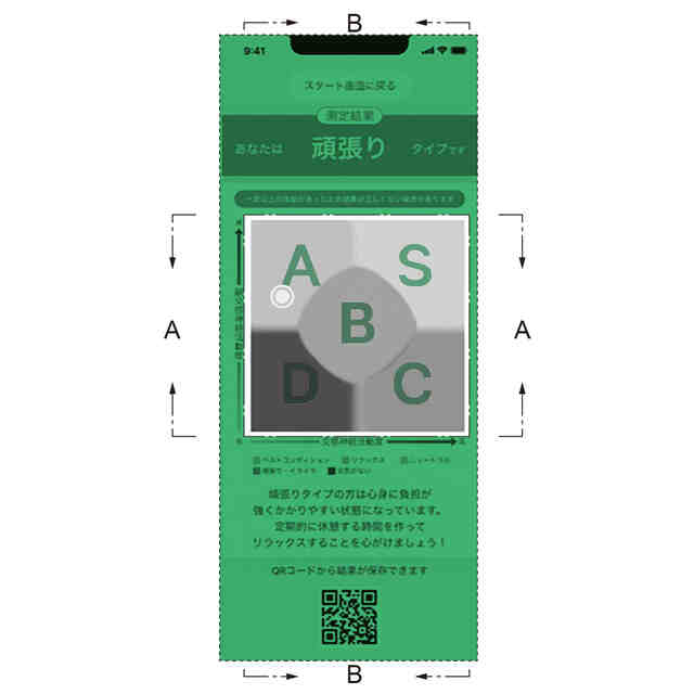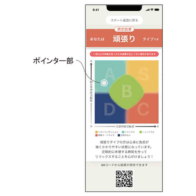 本画像は、センサー等を用いて取得した自律神経等に係るデータに基づいた測定結果を表示するための画像である。「使用状態を示す参考画像図」に示すように、ポインター部が表示される位置により、測定対象者のパターンやコンディションを把握することができる。