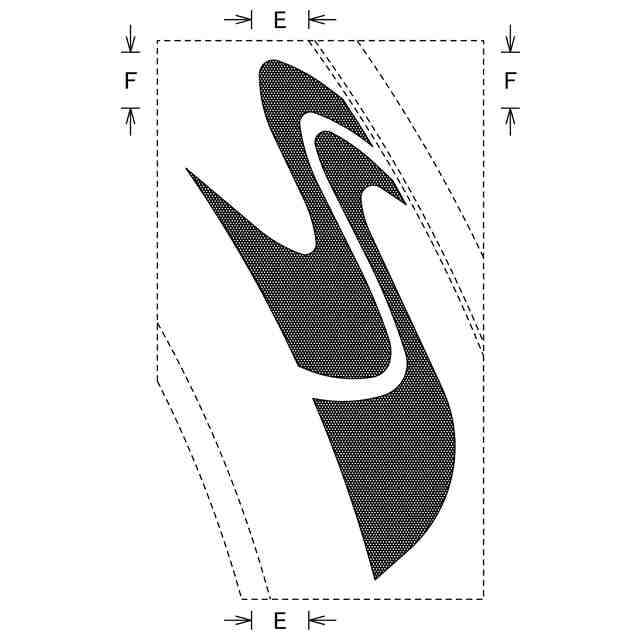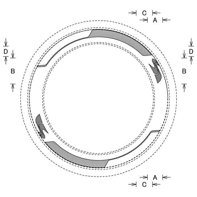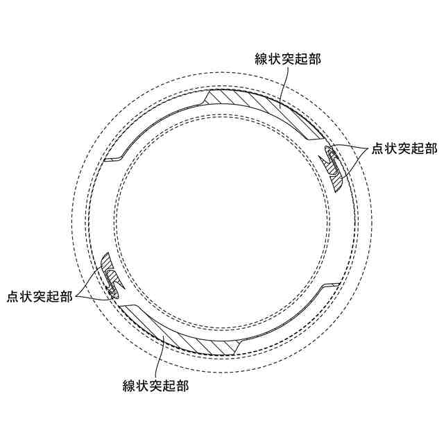 実線で表した部分が、意匠登録を受けようとする部分である。各部の名称を示す参考図に示すように、サイドウォール部は、複数の線状突起が形成された線状突起部(左上傾斜ハッチングで示す領域)と複数の点状突起が形成された点状突起部(右上傾斜ハッチングで示す領域)とを有している。参考斜視図に示すように、点状突起部には複数の点状突起が配置されている。