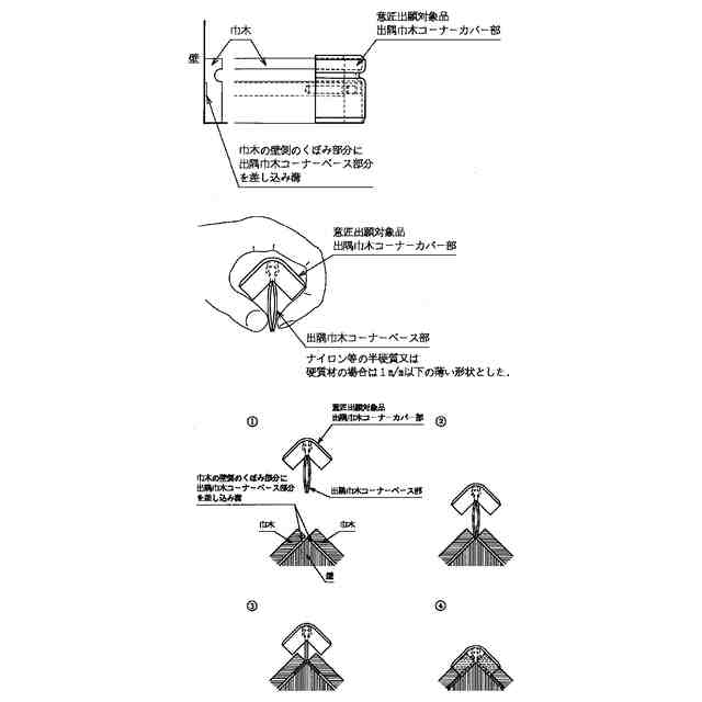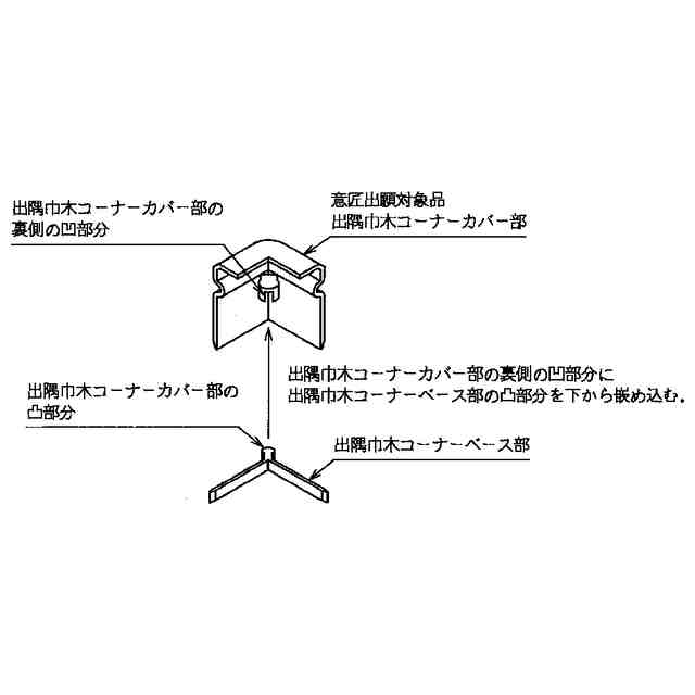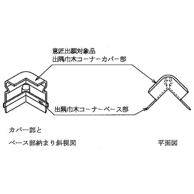 この意匠に係る物品は、壁面の下端コーナー部での巾木の繋ぎ処理に用いられる出隅巾木コーナー材であり、(使用状態図1)のように出隅巾木コーナーベース部と出隅巾木コーナーカバー部材を嵌合して使用される。 (使用状態図2)より出隅巾木コーナーカバー部の裏側の凹部分に、出隅巾木コーナーベース部の凸部分を下から嵌め込むことで出隅巾木コーナーカバー部と出隅巾木コーナーベース部とが外れにくくしている。 出隅巾木コーナーカバー部は材質ABS等の硬質樹脂を使用することで外部からの衝撃に耐えうる材質を使用している。 (使用状態図3)より巾木の壁側のくぼみ部分にナイロン等の半硬質又は硬質材の場合は1m/m以下の薄い形状とした出隅巾木コーナーベース部分を差し込み溝に差し込んで取付ける。