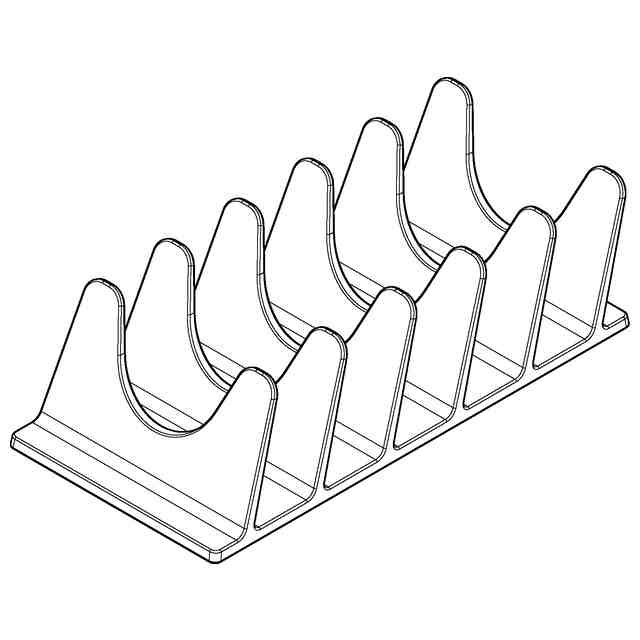 本願意匠に係る物品(以下「本物品」という。)は、略矩形板状の台と、この台上に長手方向略等間隔置きに立設する複数の仕切り壁とを備え、使用状態を示す参考斜視図に示すように、メイクパレットなどの薄板状のパレット類を各仕切り壁に立て掛けた状態で台上に収容するパレット収容台である。本物品の各仕切り壁は、台に対し長手方向一側に向かって互いに略平行にほぼ110°程度傾斜していて、それぞれ仕切られた仕切り壁同士の間にパレット類が斜めに立て掛けられている。また、本物品の各仕切り壁は、上端の中央に略U字状の切欠がそれぞれ設けられ、切欠を介して仕切り壁同士の間のパレット類の種類が確認できるようにしている。更に、本物品の各仕切り壁は、それぞれの一側面及び他側面が下端から上端に行くに従い肉厚が略半分程度まで薄くなるようにテーパー状に形成され、仕切り壁同士の間にパレット類が上方から差し込み易くなっている。