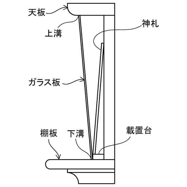 本物品は、神を祀るための簡易的な神棚である。本物品の神棚は、3体の神札を横に並べて載置可能な載置台を備える。載置台の手前には、ガラス板が設けられている。ガラス板は、上端部が天板の上溝に嵌め込まれるとともに下端部が棚板の下溝に嵌め込まれている。ガラス板は、上方部が下方部よりも前方に位置するように傾斜した状態で保持されている。ガラス板における正面の表面の下方中央には、円形の鏡面加工部分が設けられている。ガラス板における正面の表面は、鏡面加工部分を除いて、下方部が磨りガラス加工によって透過率が低く、上方に向かうに連れて透過率が高くなり、上方部が透明である。ガラス板における背面の表面は、透明であり、正面の表面における鏡面加工部分の不透明な裏側部分及び磨りガラス加工部分が透けて表れる。本物品の正面に立って斜め下方から見上げることになる参拝者は、ガラス板の透明な部分及び磨りガラス加工部分を通じて神札を視認できるとともに、ガラス板の鏡面加工部分に写る自身の姿を視認できる。