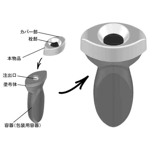 本物品はカバー部と栓部とを備える包装用容器の栓付きのカバーであり、使用状態参考図に示すようにフェルト製の塗布体を容器の上部に設けた包装用容器に対して、塗布体をカバーすると共に、注出口の栓をするためのものである。