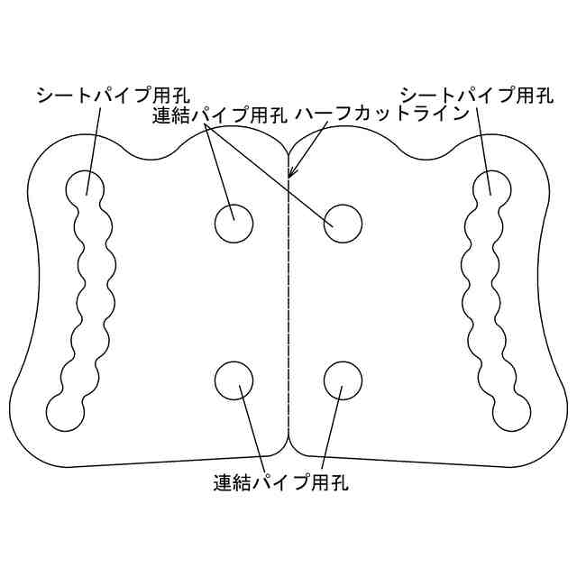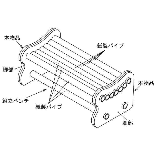 本物品は、樹脂、紙、再生紙などからなるシート材と紙製パイプからベンチとして組み立てられる組立ベンチの一対の脚部の一つとして用いられるベンチ脚部用ブランクシートである。本物品は、[各部名称を示す参考正面図]のミシン目であるハーフカットラインで二つ折りに折り返したり、折り返した物を複数枚重ねたりすることでベンチの一対の脚部の一つが形成される。そして、本物品は、組立ベンチの脚部として二つ折りにした本物品、又は二つ折りにした本物品を所定距離離間して一対並べてそれぞれのシートパイプ用孔及び連結パイプ用孔([各部名称を示す参考正面図]参照)に複数本の紙製パイプを挿入して組み立て連結することで、[使用状態を示す参考斜視図]及び[使用状態を示す参考写真]に示すように、屋外又は屋内で使用されるベンチとして使用される。