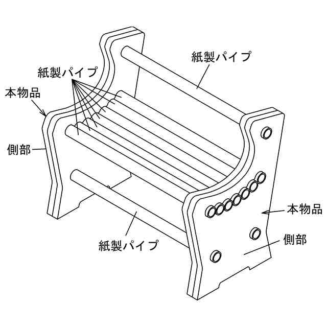 本物品は、樹脂、紙、再生紙などからなるシート材と紙製パイプからチェアーとして組み立てられる組立チェアーの一対の側部の一つとして用いられるチェアー側部用ブランクシートである。本物品は、[各部名称を示す参考正面図]のミシン目であるハーフカットラインで二つ折りに折り返したり、折り返した物を複数枚重ねたりすることでチェアーの一対の側部の一つが形成される。そして、本物品は、組立チェアーの側部として二つ折りにした本物品同士、又は二つ折りにした本物品を重ねた物同士を所定距離離間して一対並べてそれぞれのシートパイプ用孔及び連結パイプ用孔([各部名称を示す参考正面図]参照)に複数本の紙製パイプを挿入して組み立て連結することで、[使用状態を示す参考斜視図]に示すように、屋内又は屋外で使用されるチェアーとして使用される。