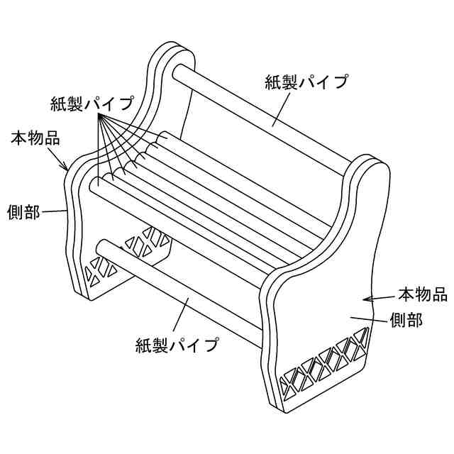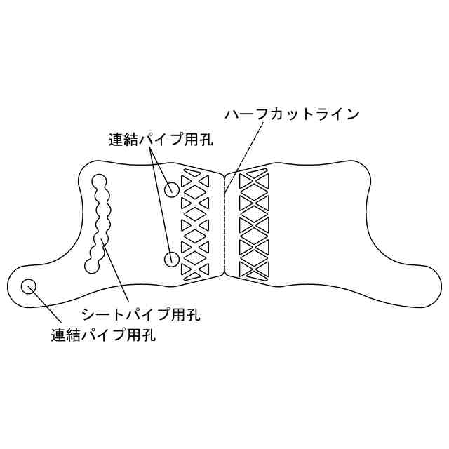 本物品は、樹脂、紙、再生紙などからなるシート材と紙製パイプからチェアーとして組み立てられる組立チェアーの一対の側部の一つとして用いられるチェアー側部用ブランクシートである。本物品は、[各部名称を示す参考正面図]のミシン目であるハーフカットラインで二つ折りに折り返したり、折り返した物を複数枚重ねたりすることでチェアーの一対の側部の一つが形成される。そして、本物品は、組立チェアーの側部として二つ折りにした本物品同士、又は二つ折りにした本物品を重ねた物同士を所定距離離間して一対並べてそれぞれのシートパイプ用孔及び連結パイプ用孔([各部名称を示す参考正面図]参照)に複数本の紙製パイプを挿入して組み立て連結することで、[使用状態を示す参考斜視図]に示すように、屋内又は屋外で使用されるチェアーとして使用される。