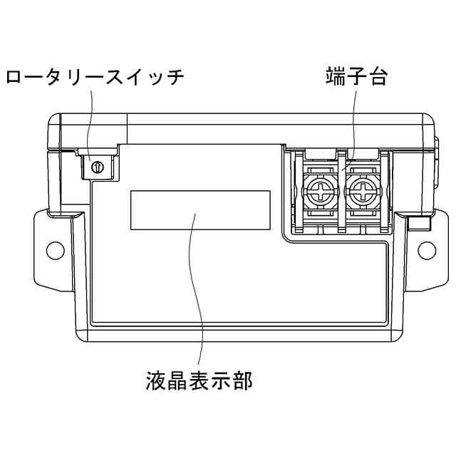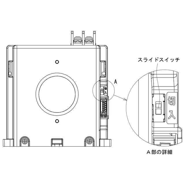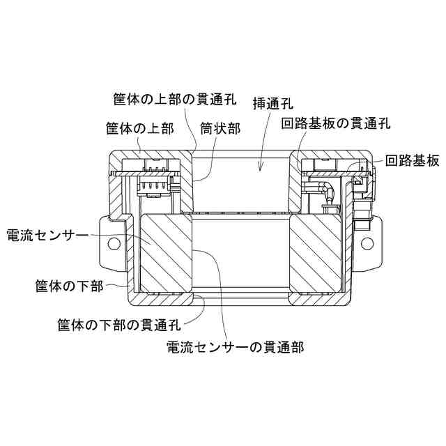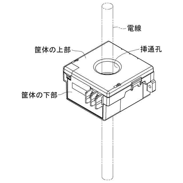 平面図と底面図に現れるように、中心部分に電線挿通用の挿通孔を有する。 右側面の参考図におけるB-B線に沿った断面図に示すように、筐体の内部に、回路基板と、貫通型の電流センサー(コア付き電流センサー)が収納されている。筐体は上部と下部に分割可能であり、筐体の上部の中心部分と筐体の下部の中心部分に、それぞれ、上下方向の貫通孔が設けられている。筐体の上部の貫通孔の周縁部は、下方に連続して延びて筒状部を形成する。また、回路基板の中心部分にも、上下方向の貫通孔が設けられている。回路基板は、その貫通孔が筒状部の外周に挿入された状態で、筐体の内部に固定される。筐体の上部の貫通孔及び筒状部と、電流センサーの貫通部(磁性体コアの内周側)と、筐体の下部の貫通孔は、上下方向に並び、電線を挿通するための一連の挿通孔を形成する。使用状態を示す参考図に示すように、本願意匠に係る電力量計を使用する際は、上記の挿通孔に電線を挿通する。 正面の参考図に示すように、正面の中央部分に液晶表示部が現れ、正面の左上部分に、アドレス設定用のロータリースイッチが現れ、正面の右上部分に、電圧入力用電線を接続する端子台が現れる。 背面の参考図に示すように、背面の中央部分に、設置箇所に設けられている取付けピン等と係合するスリット状の引掛け用の凹部が現れる。底面の参考図に示すように、右側端部の中央部分に、終端抵抗設定用のスライドスイッチが現れる。 右側面の参考図に示すように、右側面の中央部分に、補助電源や通信機器との接続用のプッシュインコネクタが現れる。