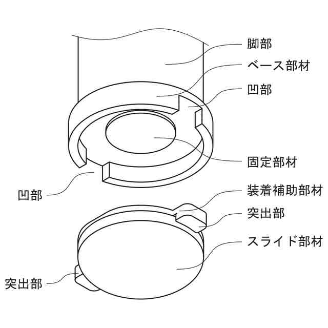 本物品は椅子脚の端部に固定する椅子脚カバー用の部品である。使用状態を示す参考図1に示すように、椅子脚カバーは、床面に接触するスライド部材と、スライド部材に固定される装着補助部材と、スライド部材の一部を収容する空間を有するベース部材と、ベース部材を脚部に固定する固定部材と、を備える。使用状態を示す参考図1に示すように、装着補助部材はスライド部材に固定した状態でスライド部材より外側に延在する突出部を有する。ベース部材は突出部と嵌合する凹部を有する。そのため、使用状態を示す参考図1および2に示すように、本物品であるベース部材を脚部に固定した状態で、装着補助部材およびスライド部材を、ベース部材に対して着脱できる。したがって、スライド部材が破損・摩耗しても、本物品を脚部に固定した状態で、スライド部材および装着補助部材のみを交換できる。