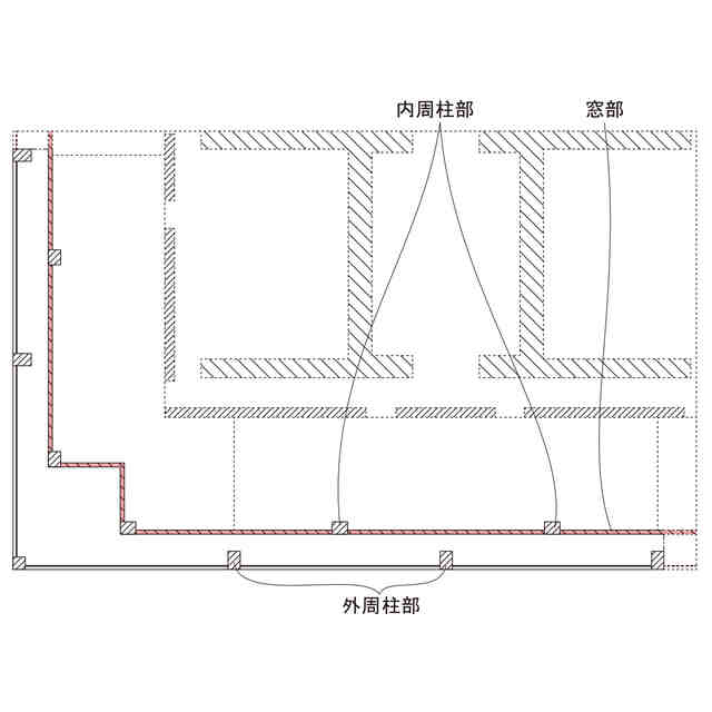 本建築物は住居、店舗、及び、オフィスなどに用いる複合建築物である。本建築物は、内周柱部と外周柱部を千鳥状に配置することにより、優れた装飾、及び、広い眺望を実現している。