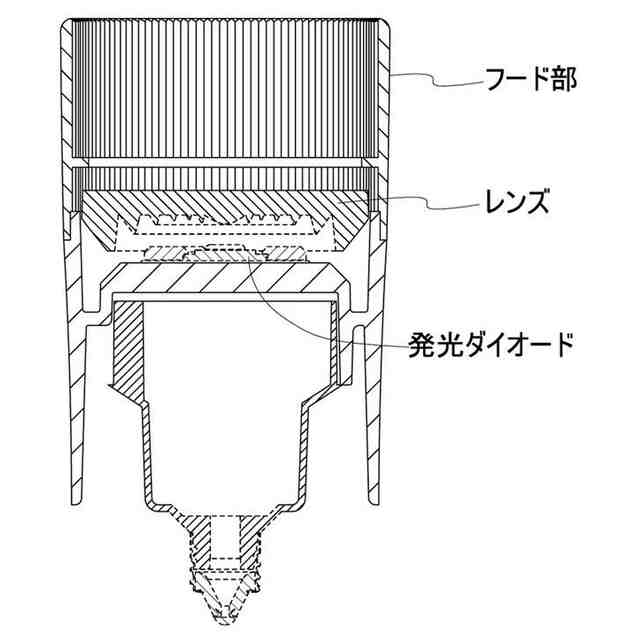 本物品は、光源となる発光ダイオードと、発光ダイオードの上部を覆い、発光ダイオードが発する光を導光するレンズを備える発光ダイオードランプである。レンズは透光性を有する。また、本物品は、レンズの周囲から光の照射方向に向かって延在するフード部を備える。