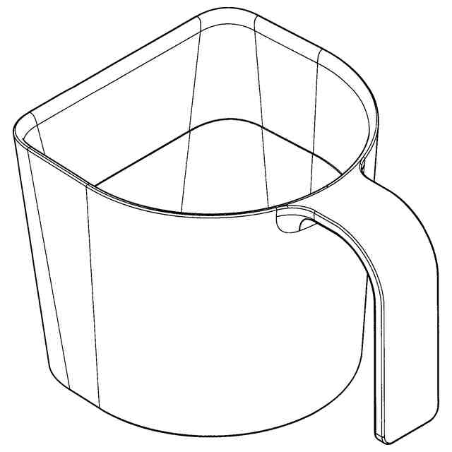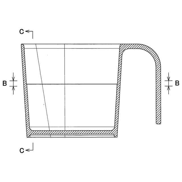 本物品は、液体や粒体、粉体などの計量に用いる計量カップである。本物品は、計量用の1/2ラインを有するカップ部とハンドル部から構成される。計量用の1/2ラインはカップ部の内面に形成されている。