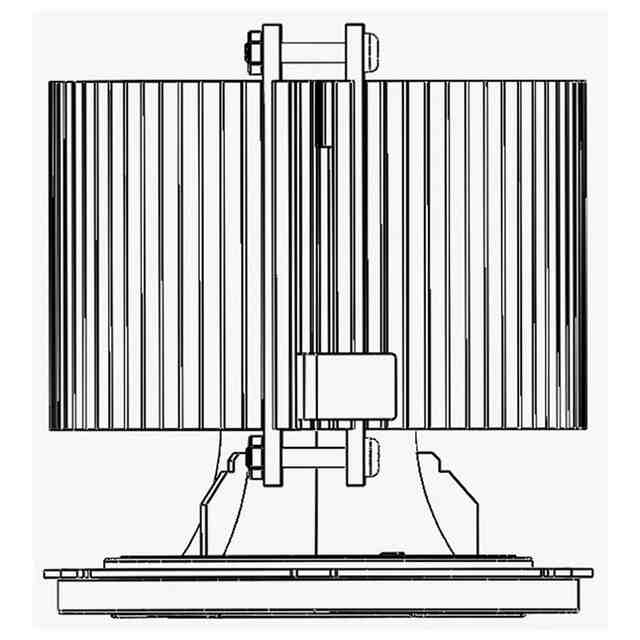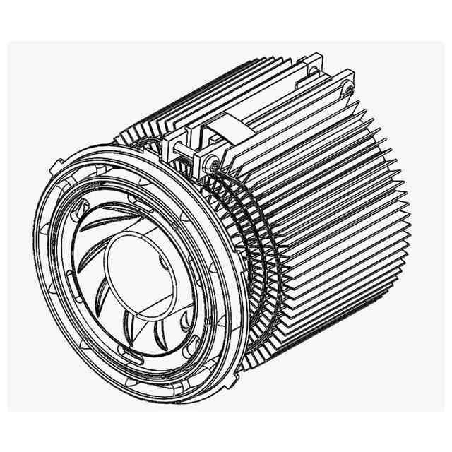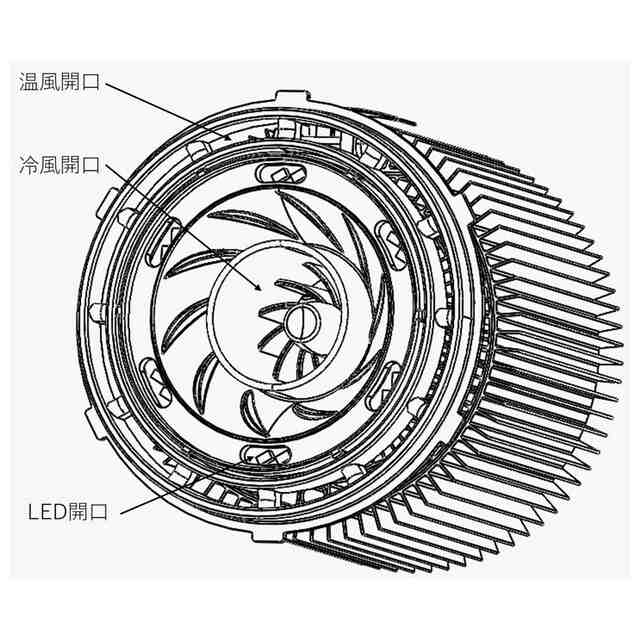 本物品のヒートシンクは、例えば[斜め下方から示した参考斜視図]のように、温風開口及び冷風開口並びにLED開口を備え、温風と冷風を同時に照射して乾燥対象物を傷めない乾燥機等に用いられるものである。