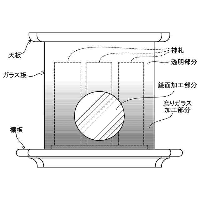 本物品は、神を祀るための簡易的な神棚である。本物品の神棚は、3体の神札を横に並べて載置可能な載置台を備える。載置台の手前には、ガラス板が設けられている。ガラス板は、上方部が下方部よりも前方に位置するように傾斜した状態で保持されている。ガラス板における正面の表面の下方中央には、円形の鏡面加工部分が設けられている。ガラス板における正面の表面は、鏡面加工部分を除いて、下方部が磨りガラス加工によって透過率が低く、上方に向かうに連れて透過率が高くなり、上方部が透明である。ガラス板における背面の表面は、透明であり、正面の表面における鏡面加工部分の不透明な裏側部分及び磨りガラス加工部分が透けて表れる。本物品の正面に立って斜め下方から見上げることになる参拝者は、ガラス板の透明な部分及び磨りガラス加工部分を通じて神札を視認できるとともに、ガラス板の鏡面加工部分に写る自身の姿を視認できる。