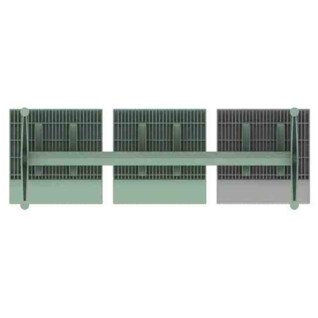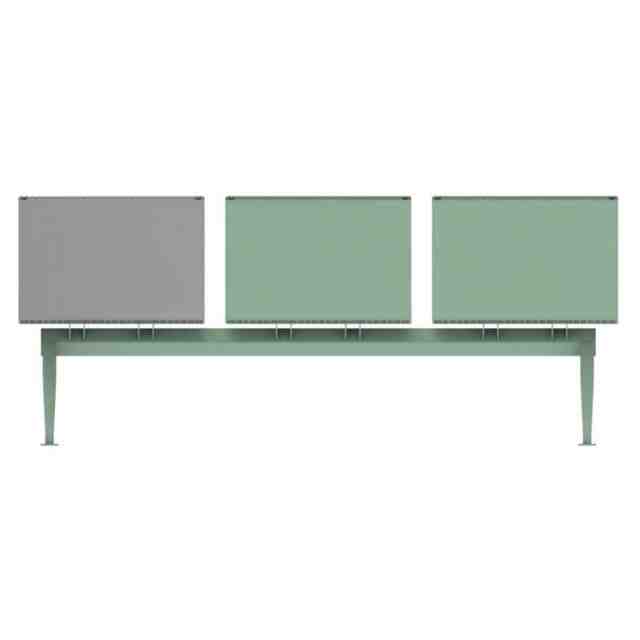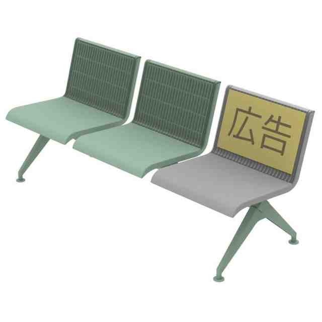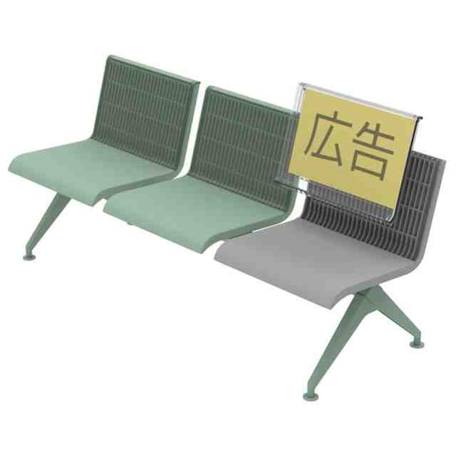 本願意匠に係る物品は、背部に広告表示が可能な3人掛けベンチである。参考図1の通り、背部は、透明の樹脂カバーで覆われている。背部の寸法に対応したサイズの紙体や樹脂製シート等の広告媒体は、背部本体と樹脂カバー間に挟まれ固定される。樹脂カバーの取り外しにより、簡単に、広告媒体の取り換えが可能である。3つの背部はそれぞれが異なる広告媒体であってもよく、3つが連続する横断型の広告表示であってもよく、訴求の幅が広がる。