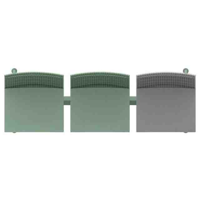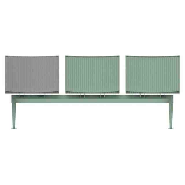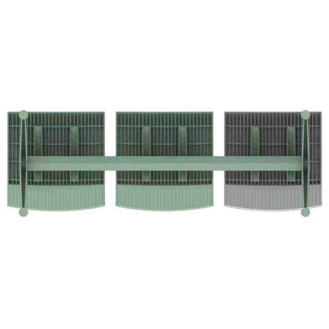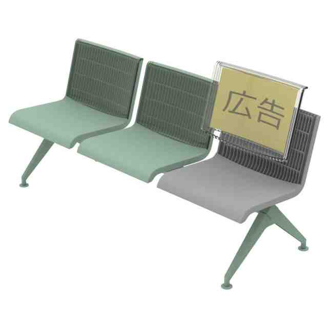 本願意匠に係る物品は、背部に広告表示が可能な3人掛けベンチである。参考図1の通り、背部は、透明の樹脂カバーで覆われている。背部の寸法に対応したサイズの紙体や樹脂製シート等の広告媒体は、背部本体と樹脂カバー間に挟まれ固定される。樹脂カバーの取り外しにより、簡単に、広告媒体の取り換えが可能である。3つの背部はそれぞれが異なる広告媒体であってもよく、3つが連続する横断型の広告表示であってもよく、訴求の幅が広がる。
