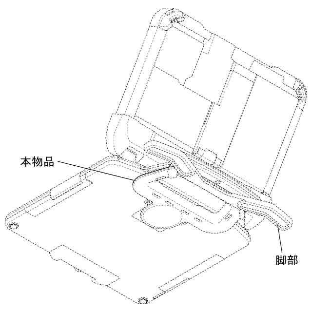 本物品は、使用状態を示す各参考図に示すように、携帯用電子計算機本体に備わるハンドルに取り付けることで、ハンドルが携帯用電子計算機本体から突出した状態に保持することができる。また、脚部によって、机上以外での使用時における転倒を防止することが可能である。使用状態を示す参考図2に示すように、脚部は着脱が可能である。